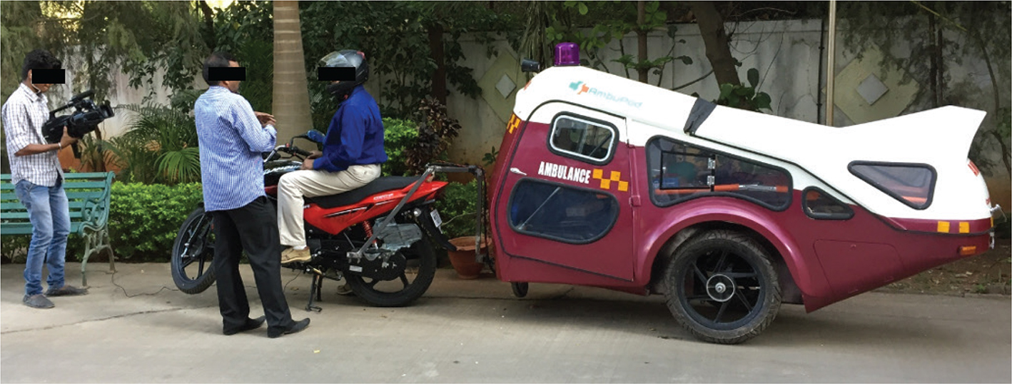 Feedback was sought from the drivers, mock patients and doctors regarding the utility, uniqueness, practicality and affordability of the invention. About 82% appreciated all four parameters; 12% were critical of one or some of the parameters while 6% were neutral. Criticisms were mainly related to the size (‘too small’), look (‘looks like a coffin’) and stability of the vehicle motor-cycle combo.