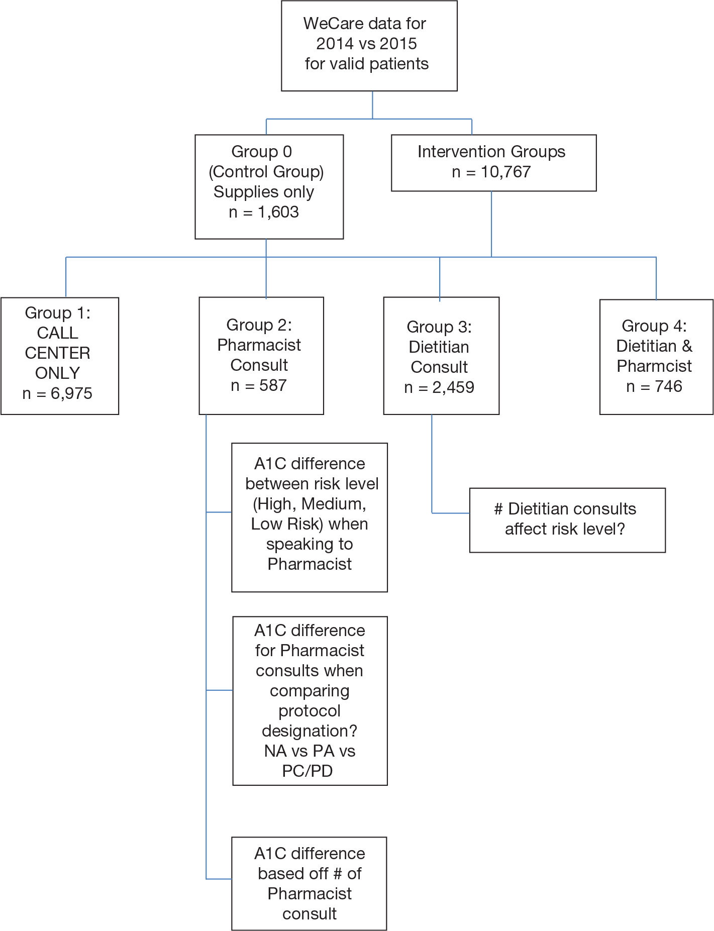 Methods: We conducted a retrospective chart review of patient data collected between December 2014 and December 2015. We compared five intervention groups of patients (n = 12,370) receiving different levels of treatment from pharmacists, registered dietitian/nutritionist and/or the call center, using telemedicine consultation techniques over a 1-year period. The control group received their supplies through the mail without any contact with the call center, pharmacists or dietitians. The cross-sectional data collected for hemoglobin A1c (A1c) were analyzed using ANOVA to assess for within-group differences in A1c reduction among groups with different risk factors.