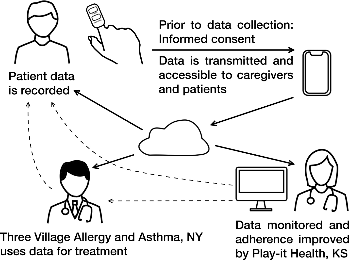 Fig. 1. Diagram describing the transfer of patient data used in the study. Solid lines denote patient RPM data, and dashed lines denote the response to patients’ record data via the pulse oximeter, which transmits to the Plan-it Med (PIM) App ® through Bluetooth technology. This data is read by a nurse or physician at Play-it Health, who summarizes weekly trends and reports findings to Three Village Allergy and Asthma, PLLC. RPM: remote patient monitoring.