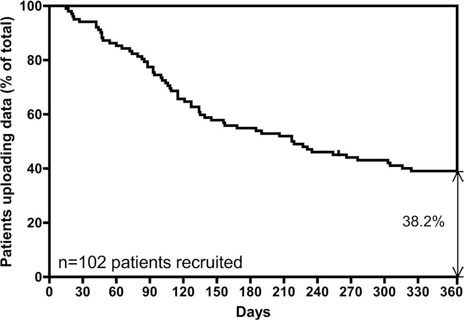 Fig. 2. Long-term RPM adherence by a group of 102 patients. One year after initiating pulse oximetry at home 38% of the patients were still reporting oxygenation and heart rate data through the app. RPM: remote patient monitoring.