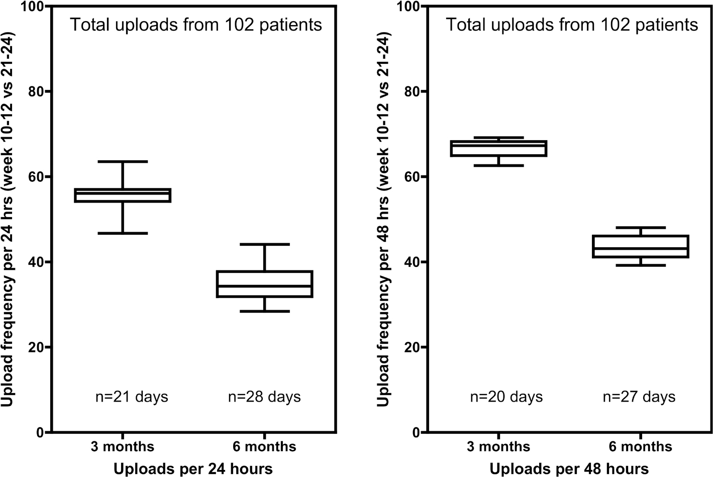 Fig. 4. Adherence to RPM reporting of pulse-oximetry data by 102 patients at 3 or 6 months after initiating the RPM reporting. The plots show the percentage of patients reporting in any given 24-h period (left plot) or 48-hour period (right plot). RPM: remote patient monitoring.