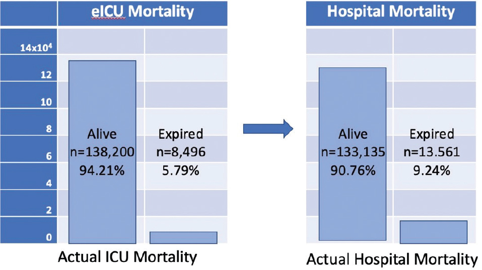 Fig. 1 Mortality statistics: eICU (left) versus hospital (right). eICU: electronic Intensive Care Unit; ICU: Intensive Care Unit.