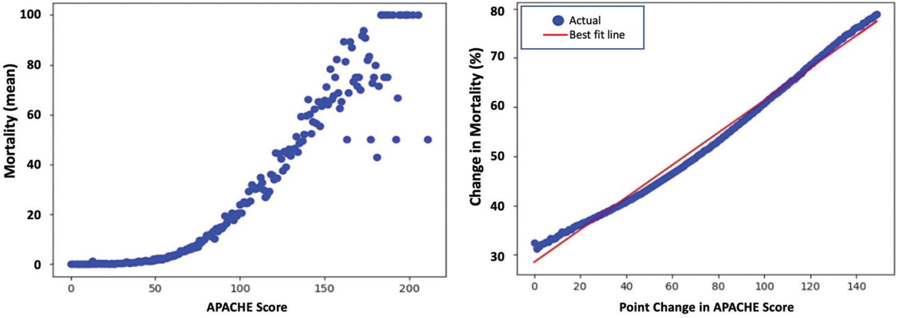 For Apache scores in the range of 0 and 150, a positive correlation is observed between APACHE score and mortality, as shown in Figure 2, Left. For most scores above 150, the average mortality rate is 100%.