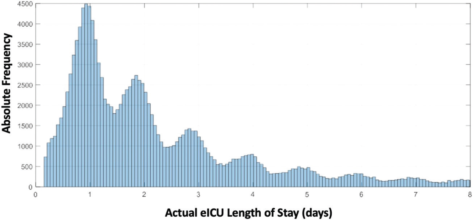 The LOS in the ICU, stored in variable actual-eICU-LOS, shows a saw shape (see Figure 5) because the values tend to be rounded to complete days, which is consistent with the fact that hospitals decide to discharge or retain patients at fixed times of the day. The most typical value for Tele-CC LOS is 2 days since the area in Figure 5 from 1 to 2 days is larger than from 0 to 1 day.