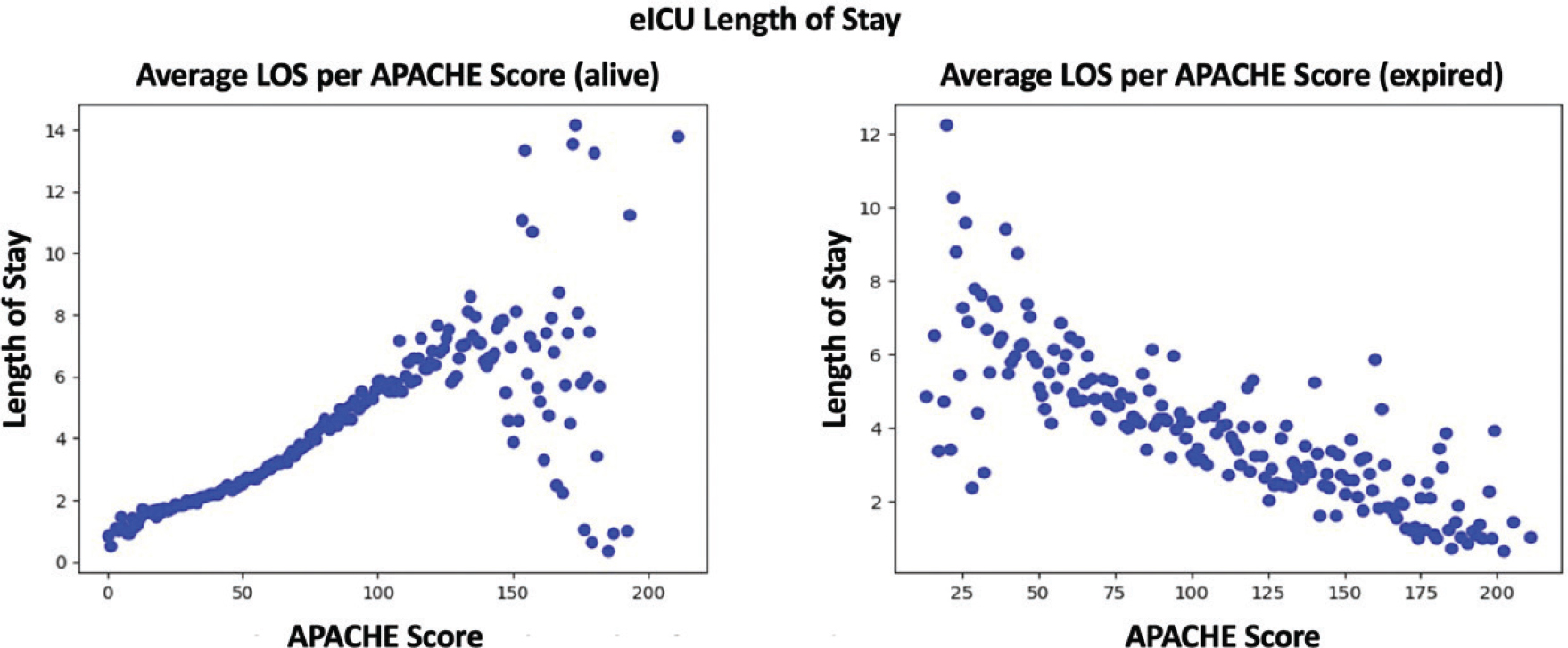 However, for patients who expired, a strong negative association exists between LOS and the APACHE score. As the APACHE score increases, the LOS may decrease as patients with more severe conditions may expire sooner (Figure 6, Right).