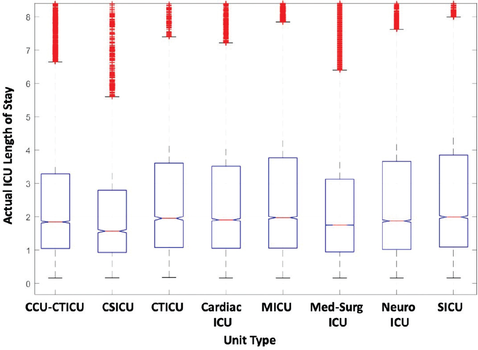 Fig. 7 Distribution of length of stay grouped by unit type. CCU-CTICU: Cardiovascular Intensive Care Unit-Cardiothoracic Intensive Care Unit; CSICU: Cardiac Surgery Intensive Care Unit; CTICU: Cardiothoracic Intensive Care Unit; ICU: Intensive Care Unit; SICU: Surgical Intensive Care Unit.
