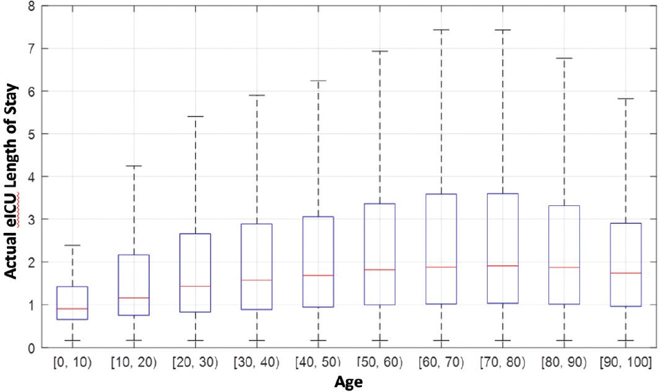 Fig. 8 Statistical representation of length of stay as distributed by age (in years). EICU: Electronic Intensive Care Unit.