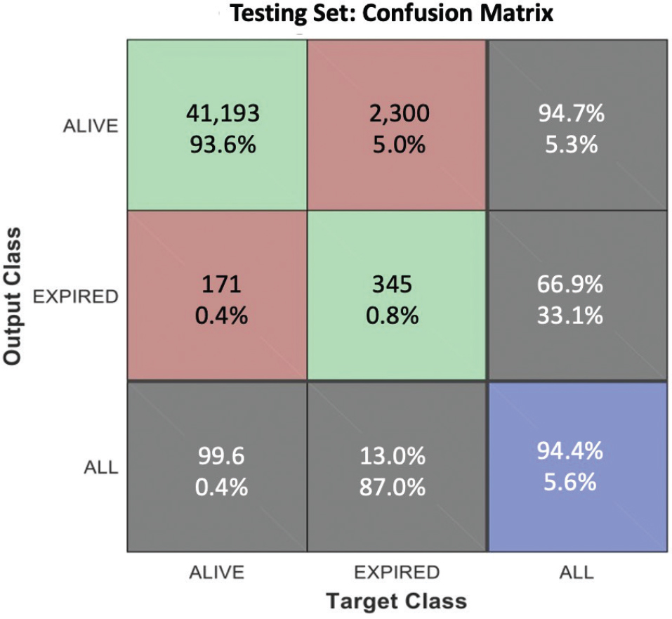 A decision tree was developed using the APACHE score and patient age as inputs. After performing the pruning process in the tree, in order to avoid overtraining, it was found that age was not a relevant input for improving predictions. This is reasonable since age is already one of the inputs used to compute the APACHE IV score, so the effect of age in the likelihood of recovery is already considered. As a consequence, the decision tree analysis involving 146,696 patients revealed that a threshold value of 134.5 is the optimal way to estimate Tele-CC mortality, meaning that if the APACHE score is less than 134.5, the patient is likely to survive within the Tele-CC unit in which the patient was admitted. The overall accuracy of this mortality prediction method is 94.4%, and the majority of the errors (5.2%) correspond to patients with APACHE scores less than 134.5 who were expected to survive, but finally expired. Figure 9 shows the test set accuracy results in terms of the confusion matrix.