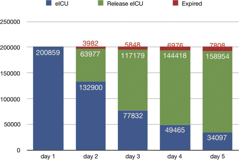 The time evolution of patients accepted to the eICU is shown in Figure 11, which was generated by analyzing the outcome of more than 200,000 patients. After Day 1, most patients stayed at the ICU, some patients were released (home or hospital), and a few expired. The majority of patients (71.8%) leave the ICU within the first 3 days, and the number of patients who need to stay further than day 5 is relatively small (14.3%). The number of new admissions is fairly constant and not difficult to estimate, and it only depends on factors external to the hospital such as weather, disease outbreaks, etc. Therefore, the most important knowledge for an accurate estimation of the size of the service comes from the estimation of evolution of patients as shown in Figure 11, which mostly depends on several factors directly related with the patient condition (age, unit type, and the APACHE score).