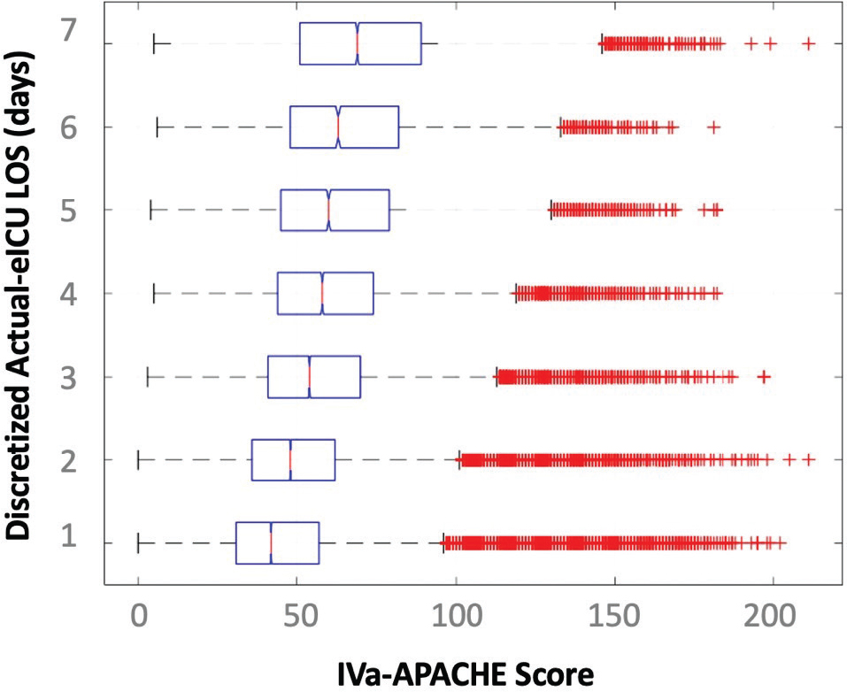 Fig. 12 Distribution of APACHE scores for patients with different discretized LOS. eICU LOS: electronic Intensive Care Unit-length of stay.