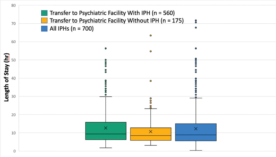 Fig. 2. Length of stay for emergency department psychiatric cases by involuntary psychiatric hold (IPH) and transfer to psychiatric facility criteria. For Transfer to Psychiatric Facility without IPH, the median length of stay = 8.5 h and mean length of stay = 10.7 h. For Transfer to Psychiatric Facility with IPH (n = 560), the median length of stay = 9.5 h, and mean length of stay = 12.7 h. For All IPHs (n = 700), the median length of stay = 8.9 h, and the mean length of stay = 12.3 h.