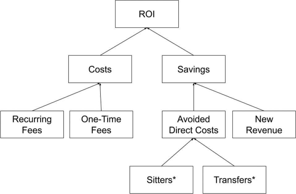 Fig. 3. Sources of costs and savings used to calculate return on investment (ROI). This diagram shows the breakdown of financial information used to calculate projected costs and savings and, ultimately, return on investment. *Indicates a cost that might be calculated differently for other hospitals.