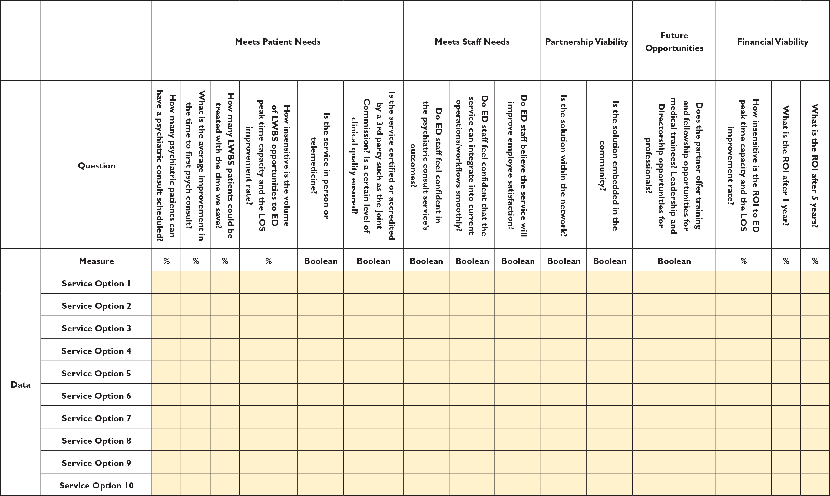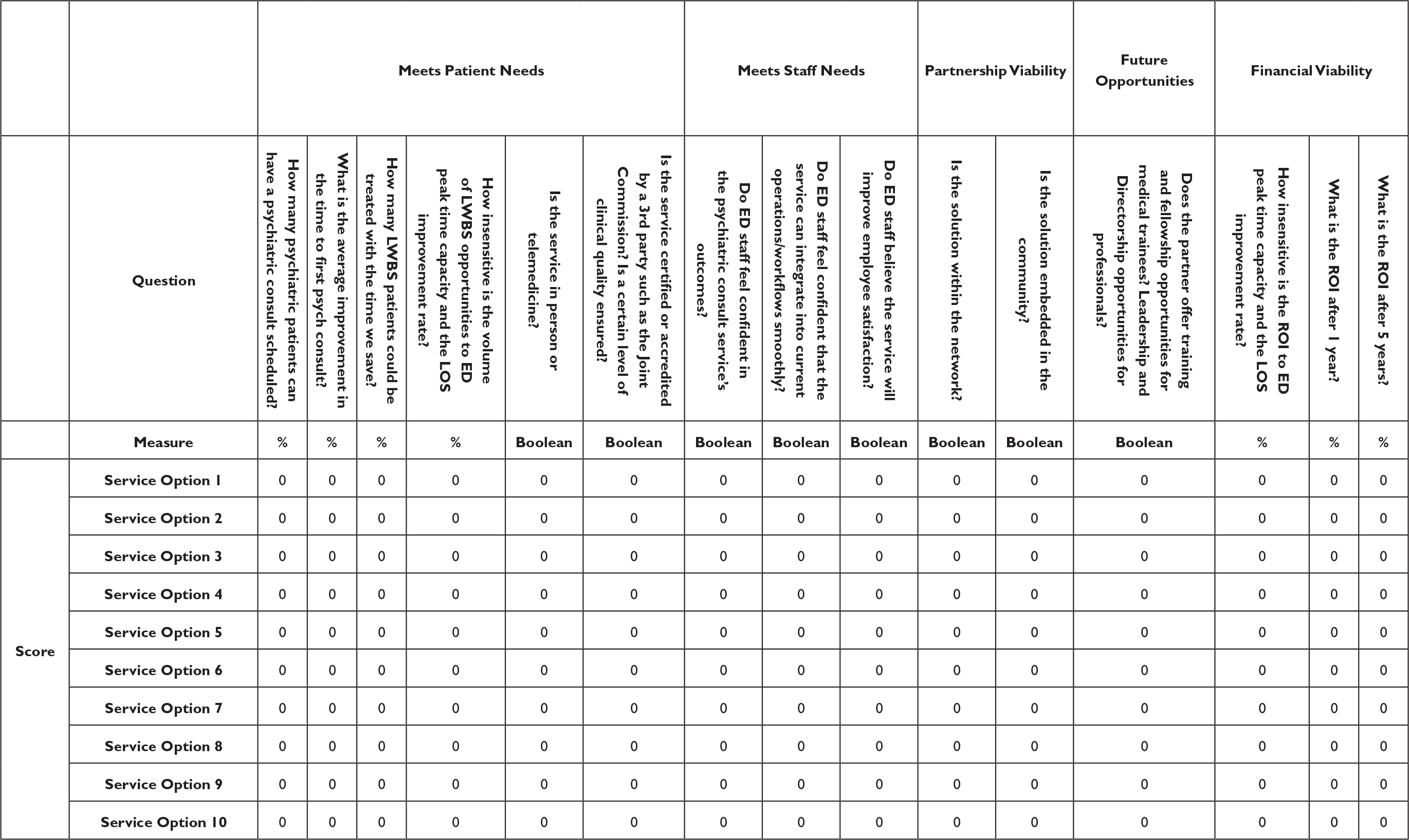 Components with percent values were converted into quintiles, with negative percent values assigned a score of 0. For example, an ROI of 65% was scored 4. Other numeric values were converted into a percent of the maximum component value and assigned a quintile score. For example, if the greatest LOS improvement across all service options was 4.6 h, then the service option offering an improvement of 1.4 h would be assigned a score of 2. For Yes/No questions, “Yes” was assigned a score of 3 and “No” was assigned a score of 0.