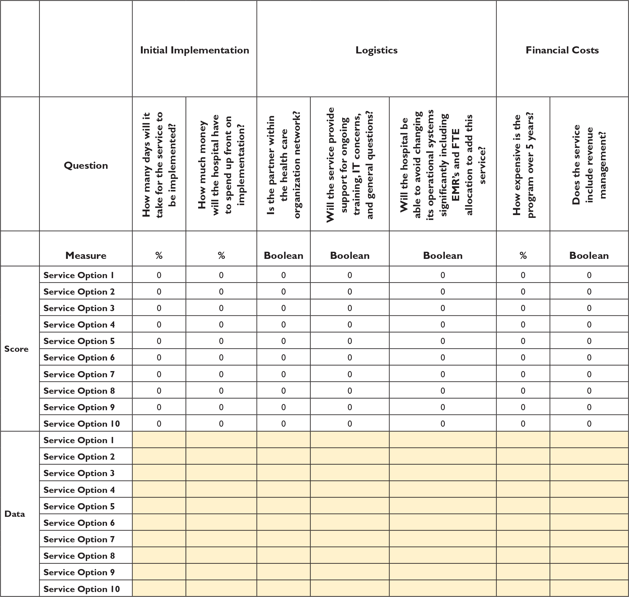 Since a higher score is better across benefits and implementation difficulty, the two will be summed together to find the one service option with the highest total