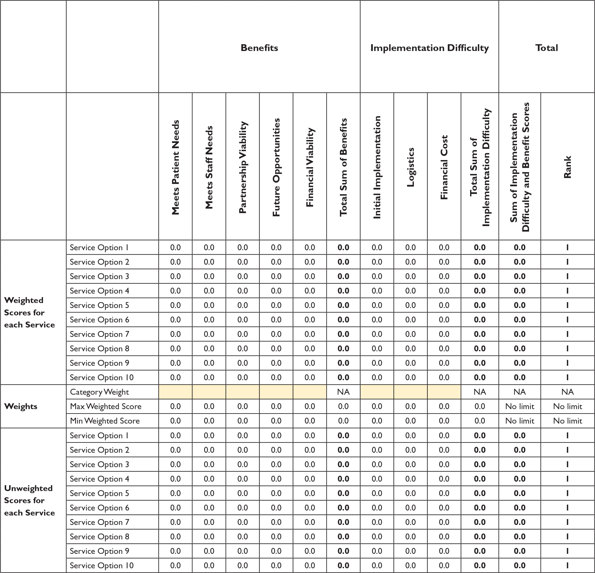 The weighted scores will be summed to create an overall “Benefit” score and “Implementation Difficulty” score per service option.