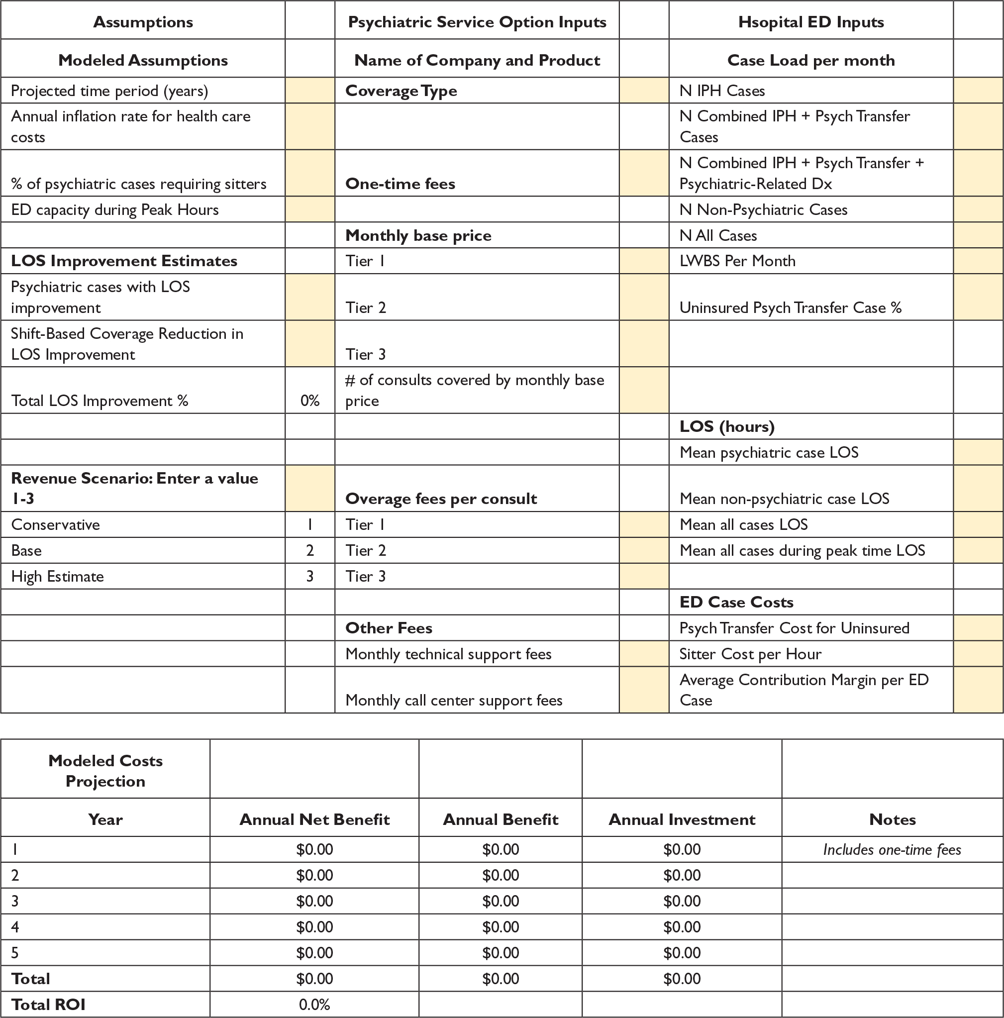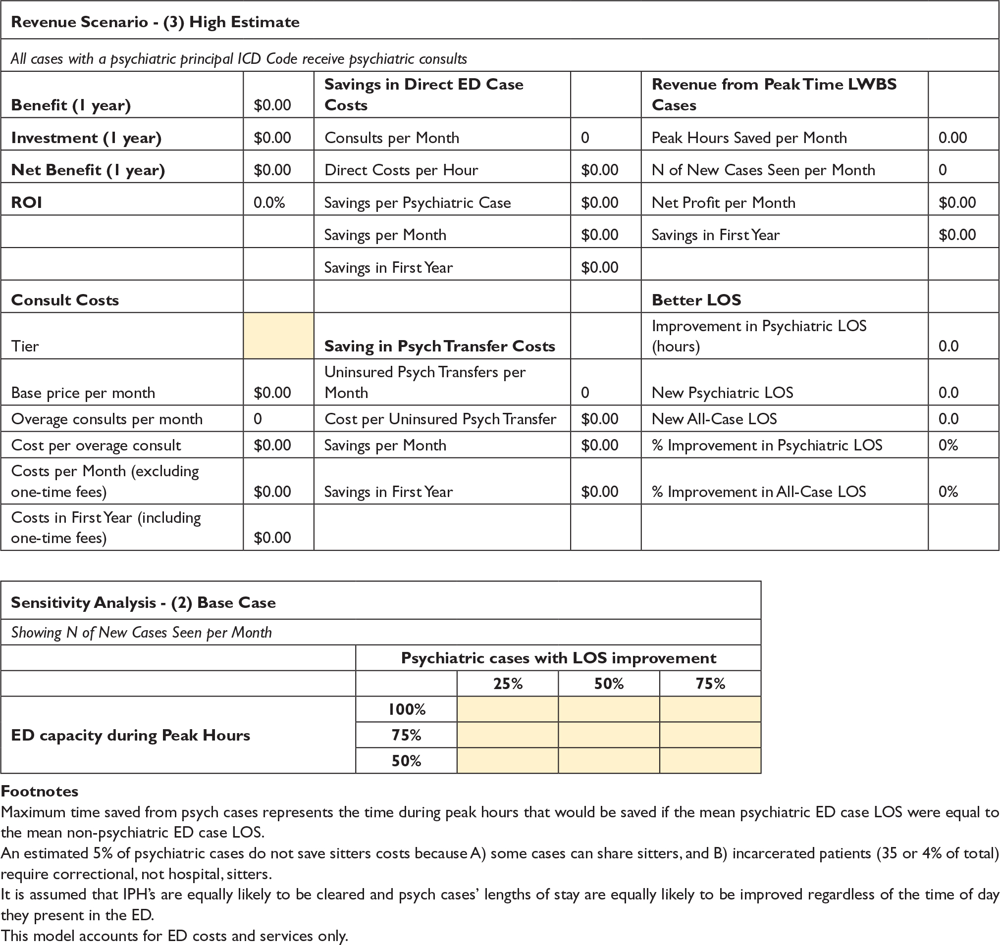 For each service option sheet, the USER must fill out the sensitivity analysis by changing assumptions for ED capacity during Peak Hours and Psychiatric cases with LOS improvement