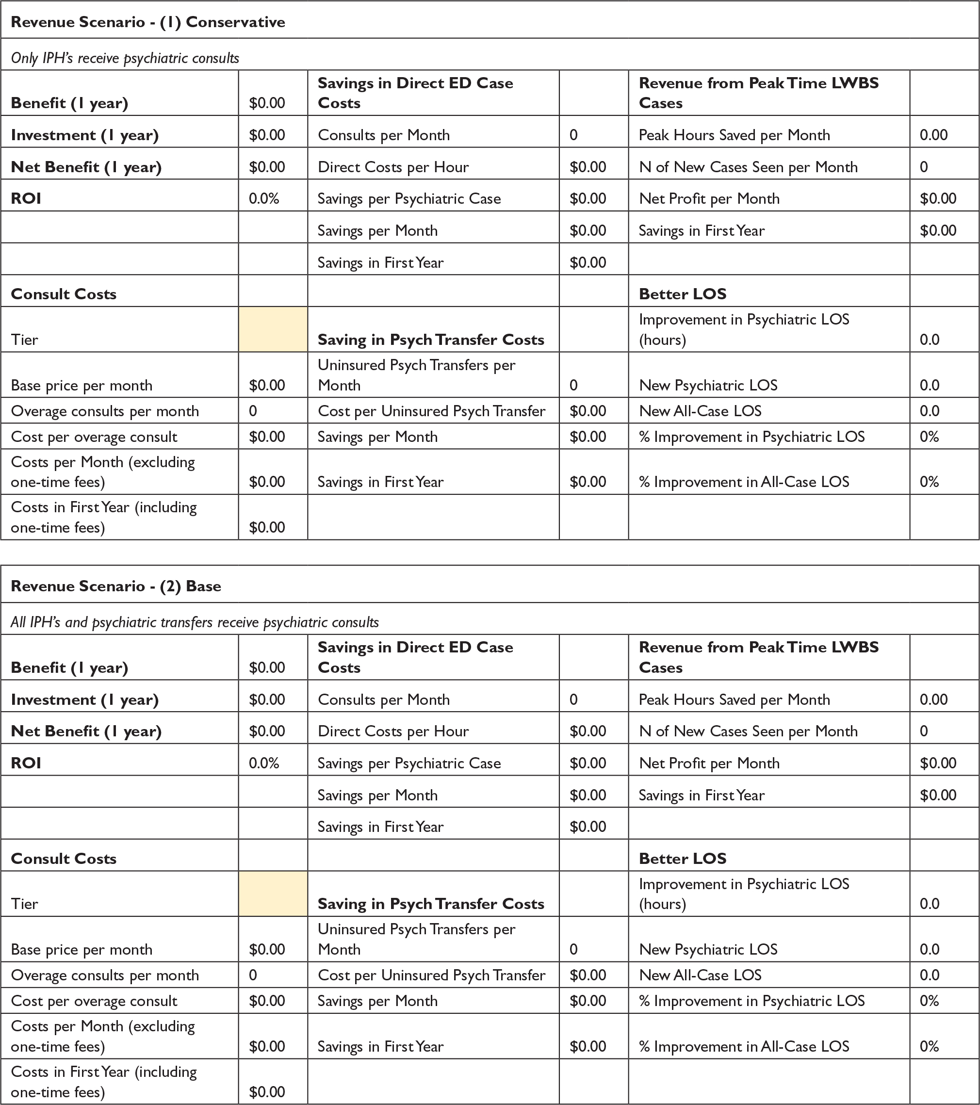 For calculating ROI, the expected return comprised two sources identified in the qualitative phase: direct costs that are currently incurred and will be avoided post-implementation and new revenue from treating ED patients who would have left without being seen (LWBS). Two direct costs associated with delays in psychiatric care were identified: sitters and funded transportation to psychiatric facilities for uninsured patients. These costs were multiplied by the psychiatric case volume and expected LOS improvement rate to represent direct cost savings. New revenue from treating patients with the time saved from psychiatric cases was calculated as the mean contribution margin per ED case multiplied by the number of additional patients that could be treated. This revenue captured the financial impact to the hospital. The financial investment required for each service option was estimated using pricing structures supplied by service options. Each pricing structure comprised two fee types: one-time implementation fees, including the purchase of equipment, and monthly fees to cover ongoing staff and technical support.