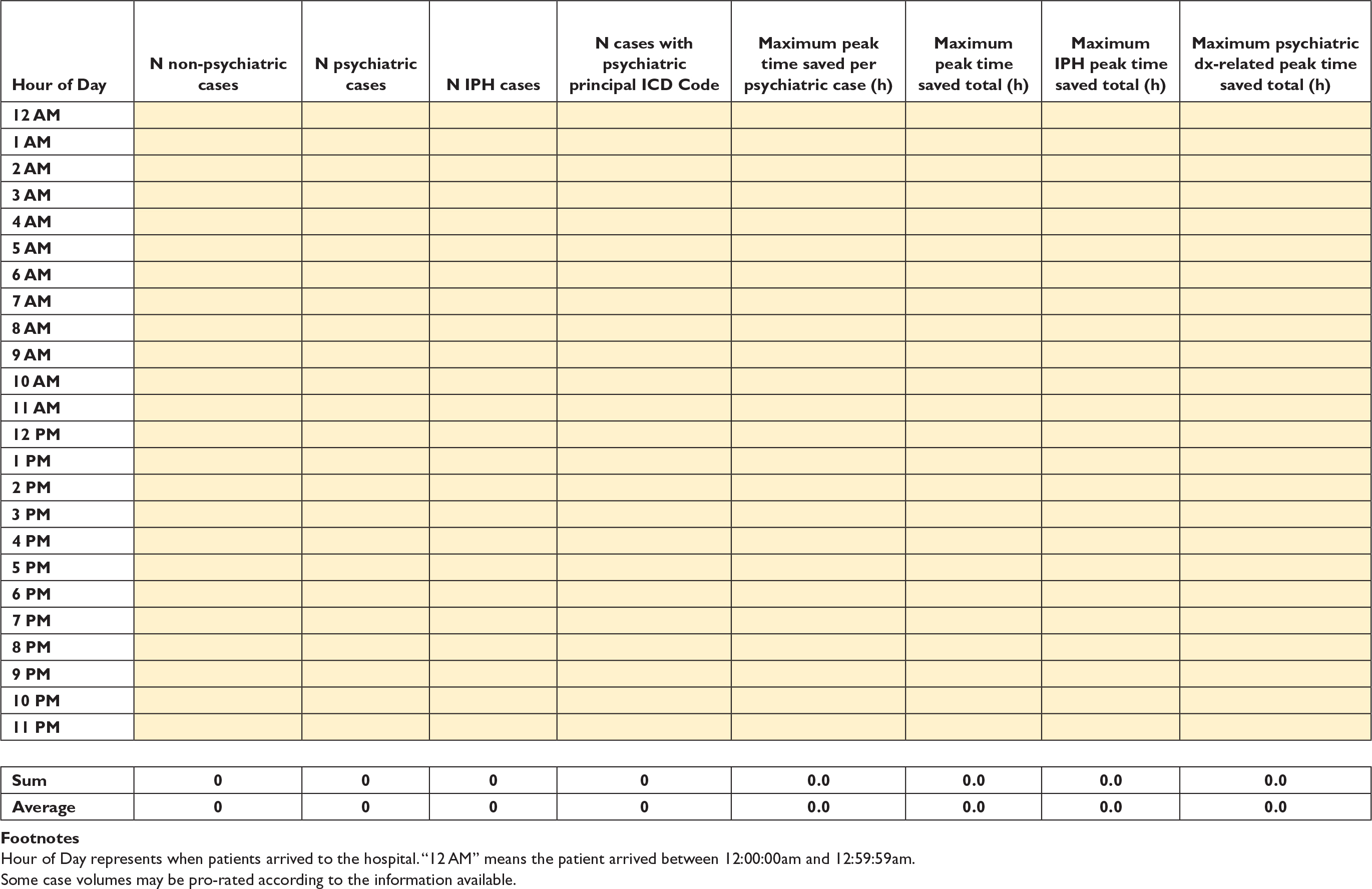 On ‘Reference - Hourly ED Arrivals’ Sheet, USER must enter data on the volume of ED cases arriving each hour: psychiatric, IPH, and non-psychiatric