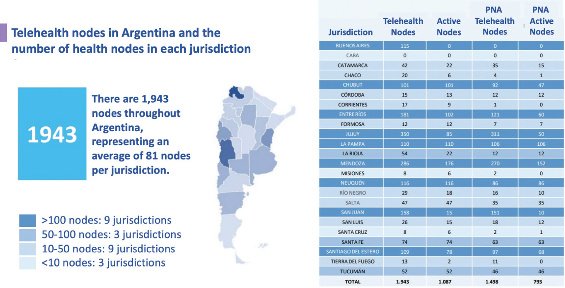 Fig. 1 Telehealth nodes in Argentina and the number of health nodes in each jurisdiction. National Telehealth Survey, National Directorate of Health Information Systems, Argentine Ministry of Health, December 2022.7