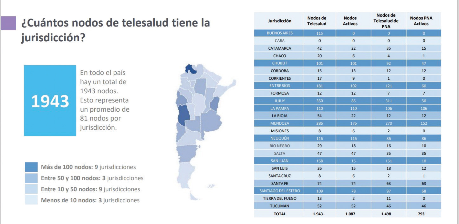 Fig. 1. Nodos de telesalud en la argentina / cantidad de nodos de salud en cada jurisdicción. Fuente: Encuesta Nacional de Telesalud, Dirección Nacional de Sistemas de Información Sanitaria, Ministerio de Salud de la Nación Argentina, diciembre 20228.