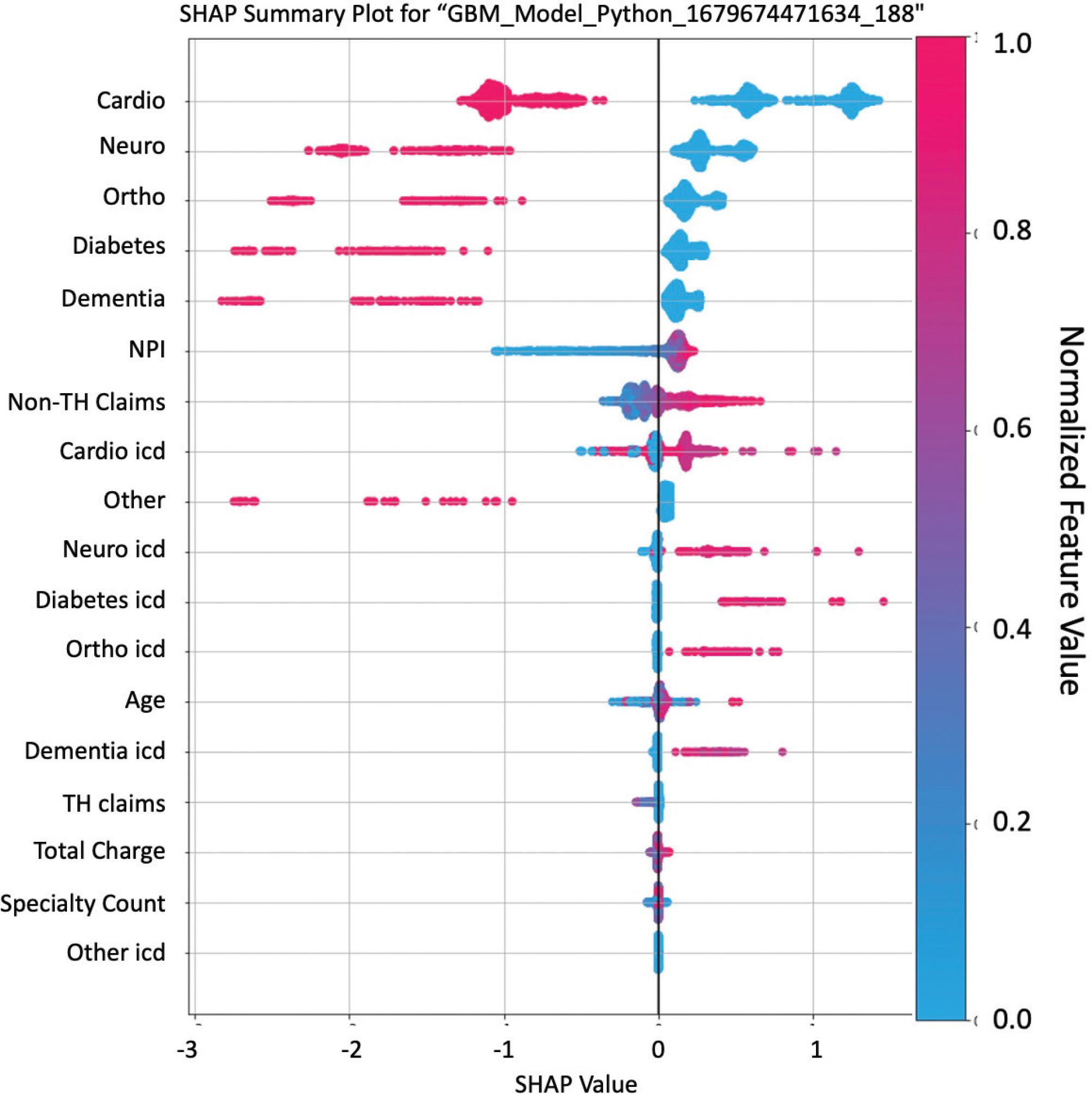 Fig. 2. Beeswarm plot of SHAP (SHapley Additive exPlanations) values. Cardio: cardiology; CI: confidence index; GBM: Gradient Boosting Machine; icd: International Classification of Diseases/ICD-10-CM; Neuro: neurology; Non-TH: non-telehealth; NPI: National Provider Identifier; Ortho: orthopedics; SD: standard deviation; TH: telehealth.