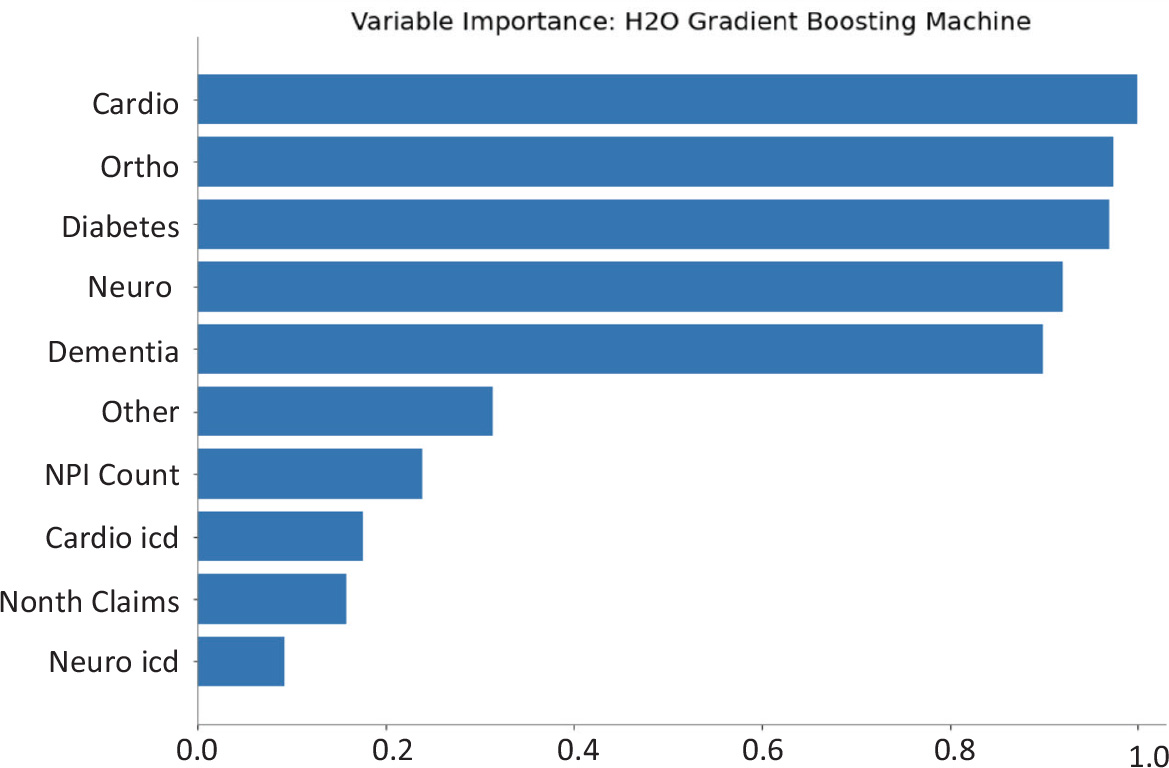 H2O Gradient Boosting Machine: An open-source machine learning platform that combines the predictions from multiple decision trees to generate final predictions. Cardio: cardiology; icd: International Classification of Diseases/ICD-10-CM; Neuro: neurology; Nonth: non-telehealth; NPI: National Provider Identifier; Ortho: orthopedics.