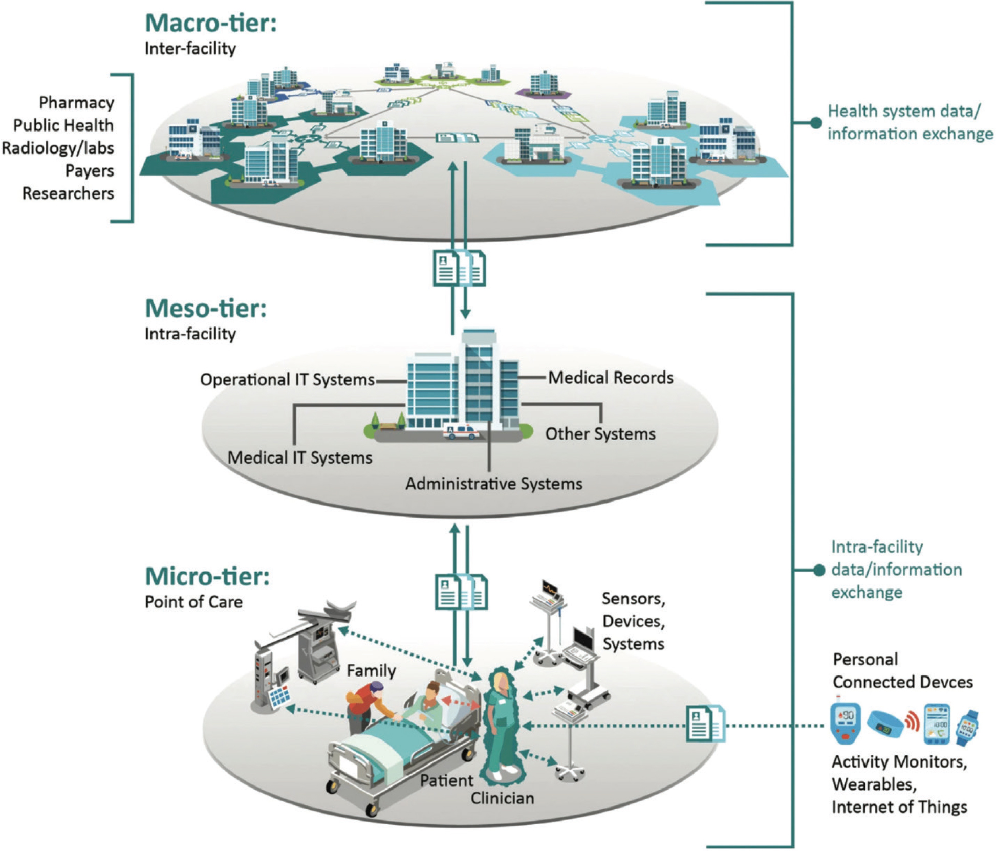 Fig. 1. Interoperability in the health ecosystem: inter-facility (macro-), intra-facility (meso-), and point-of-care (micro-) tiers.3 National Academy of Medicine.