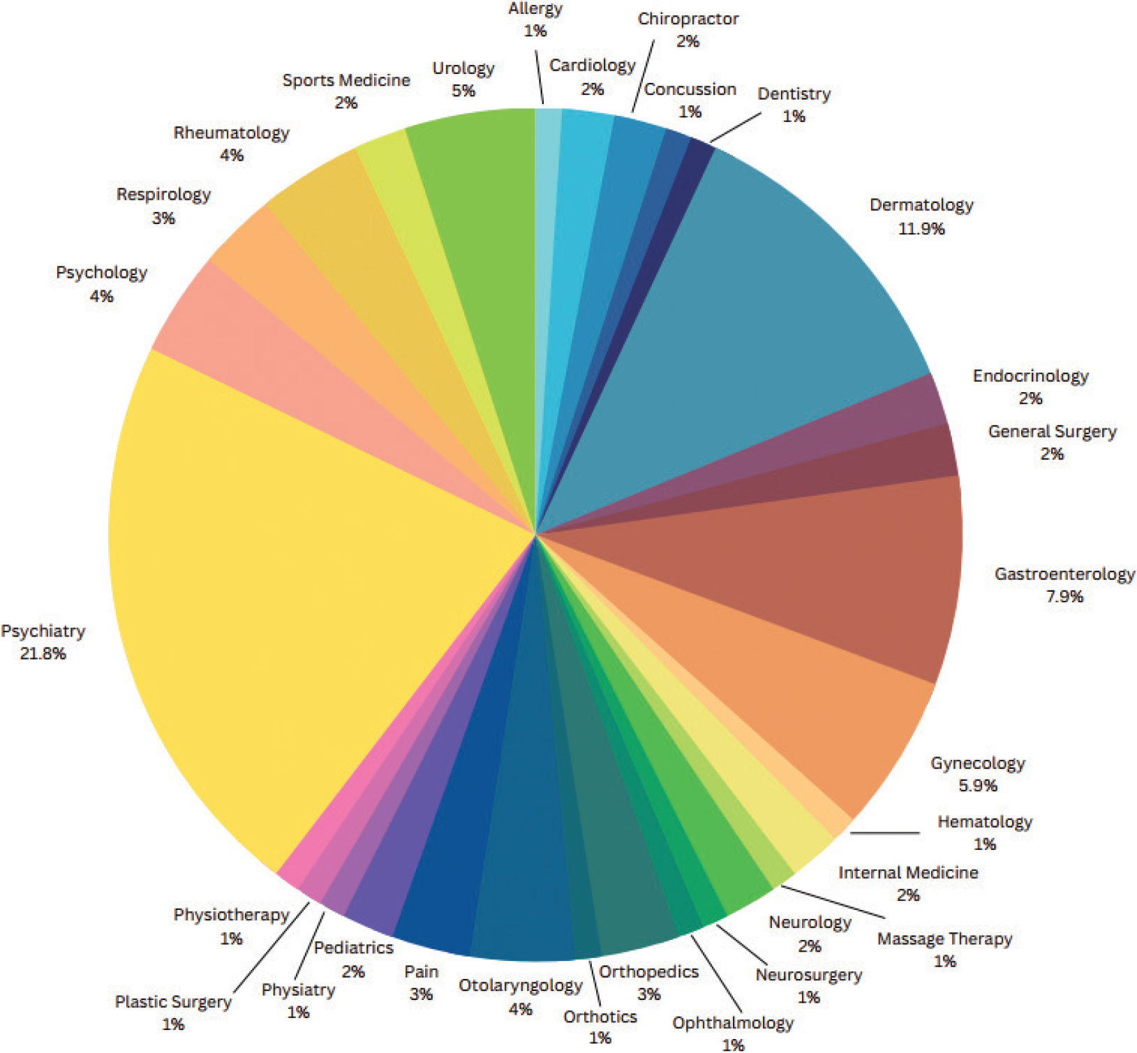 Rocket Doctor resolved or provided follow-up on 94% of encounters, with 1% referral to the emergency department (Figure 6). The most common referrals to specialists on the Rocket Doctor platform included psychiatry, dermatology, gastroenterology, gynecology, and urology (Figure 7).