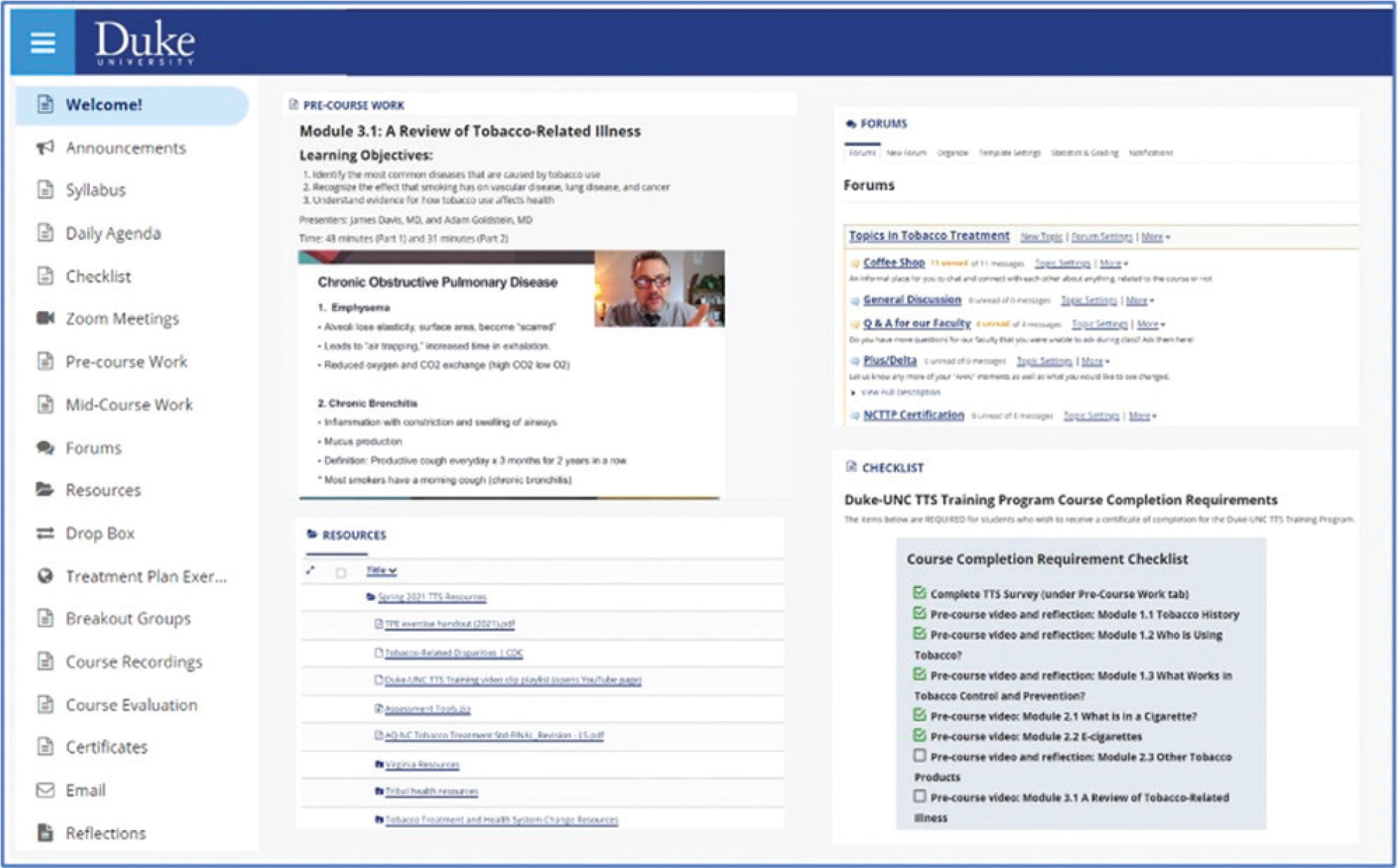 The redesigned Duke-UNC TTS course used the flipped classroom model, which entails students learning foundational course material prior to virtual class sessions via video modules and using class time for more dynamic content.8 Live course sessions—consisting of interactive lectures, small group breakout sessions, and tobacco treatment visit demonstrations—were presented in half-day sessions using the Zoom videoconferencing platform. Course materials were housed on Sakai, a learning management system that served as an online hub for participants to access video modules, communicate with course instructors, and log progress throughout the course (Figure 1). This paper is the first we are aware of to report outcomes of the transition of TTS training from an in-person to a virtual format.