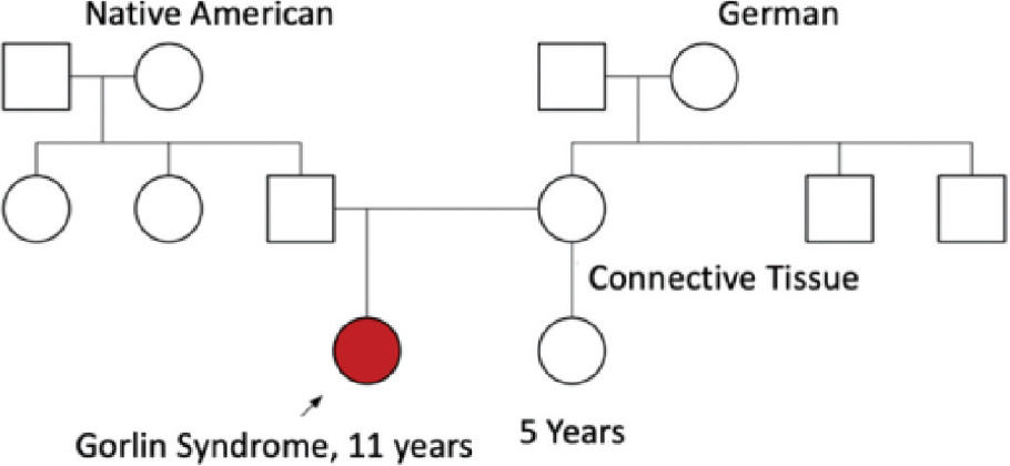 During the telehealth visit a three-generation family history was obtained (Figure 4). No individuals with jaw keratocysts or basal cell cancers were reported. The mother reported possible lupus/mixed connective tissue disorder. Her brother had attention-deficit/hyperactivity disorder. Another brother had a connective tissue disorder. At the time of initial consultation, the father of the patient had a cyst on his arm but no known basal cells.