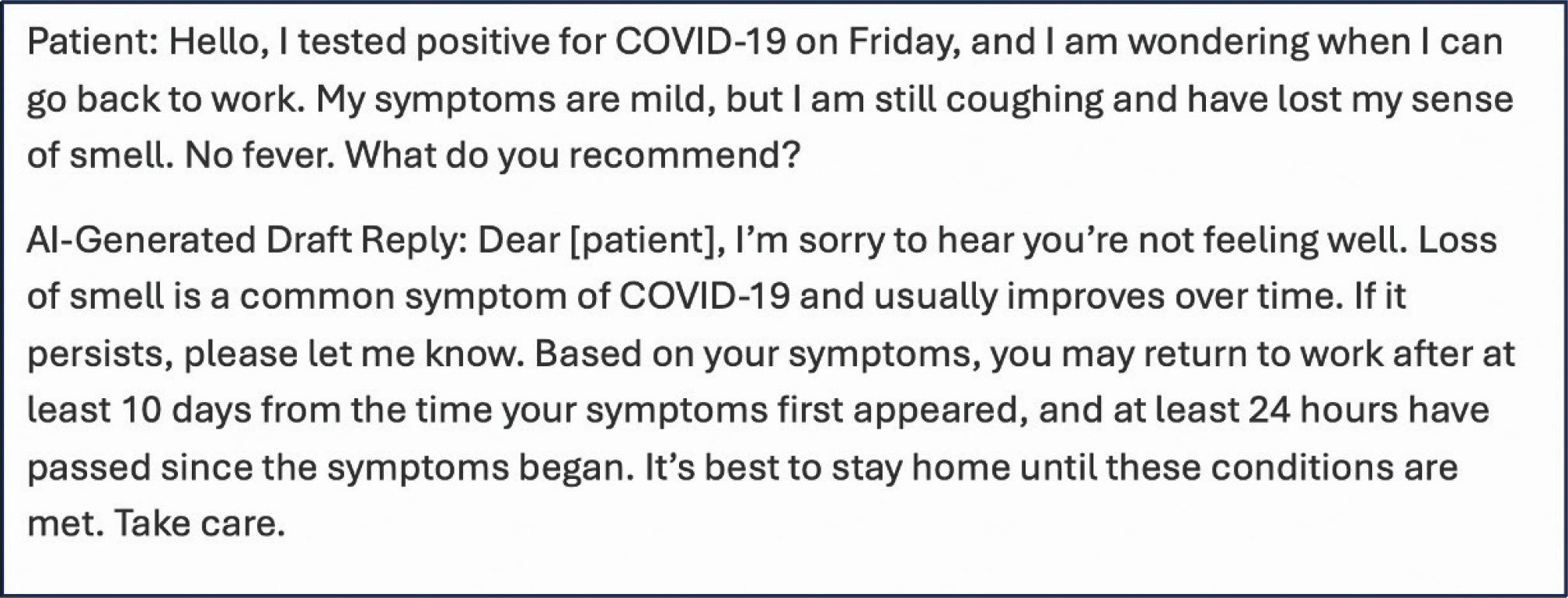 One integrated healthcare delivery system is piloting AI-powered tools with virtual care workflows to help nurses reduce cognitive load and decrease response time to patient messages. The initial pilot includes over 1,000 nurses practicing in family medicine, internal medicine, and pediatrics, associated with 200 outpatient clinics across northern California. The AI tool uses a large language model to analyze structured and unstructured data within the electronic medical record to generate text responses that nurses can use to draft a response to the patient in a welcoming, human-like tone (Figure 1).