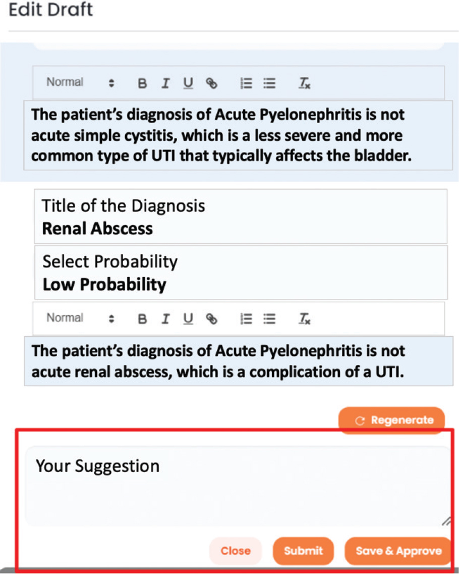 Figure 1 illustrates a conceptual user interface for this feedback mechanism, showing how clinicians might edit the model’s output to improve accuracy.