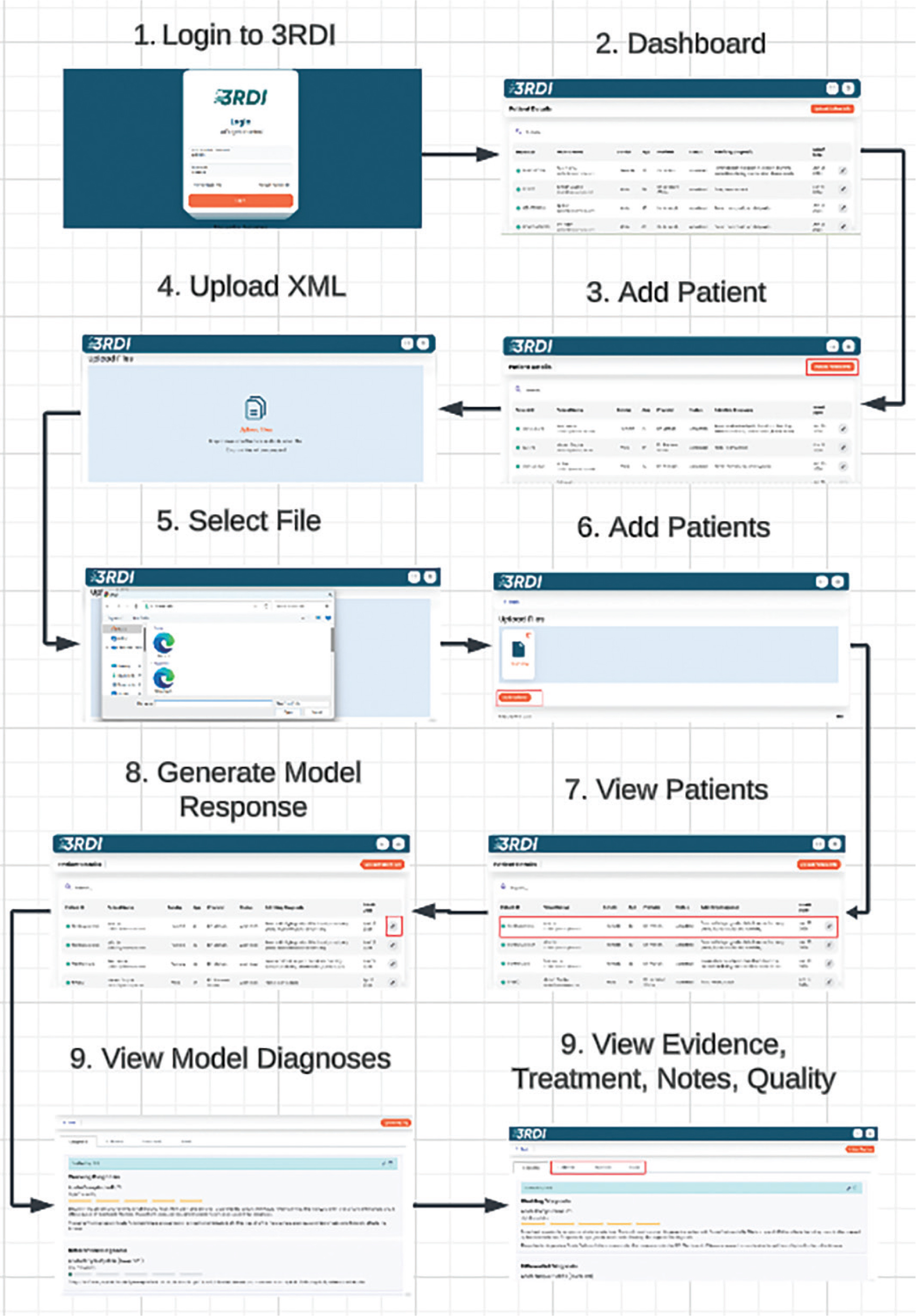 Fig. 2. A nine-step process from the platform’s login page to receiving the model response in DETNQ format for a new patient. 3RDI: an automatic photographic apparatus; DETNQ: Diagnosis, Evidence, Treatment Plan, Notes, Quality; XML: eXtensible Markup Language.