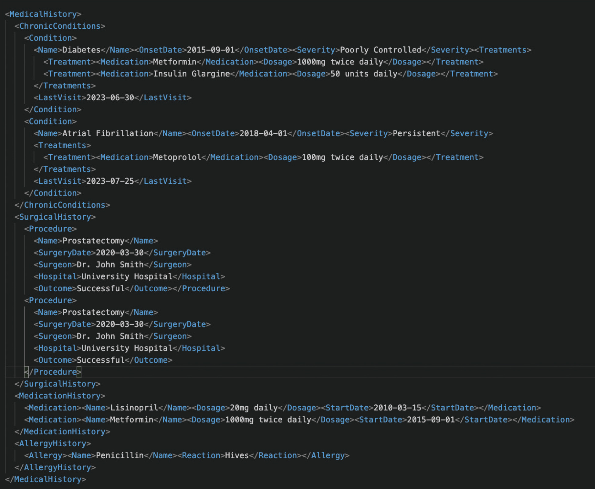 Appendix A. An example of medical history XML (eXtensible Markup Language).