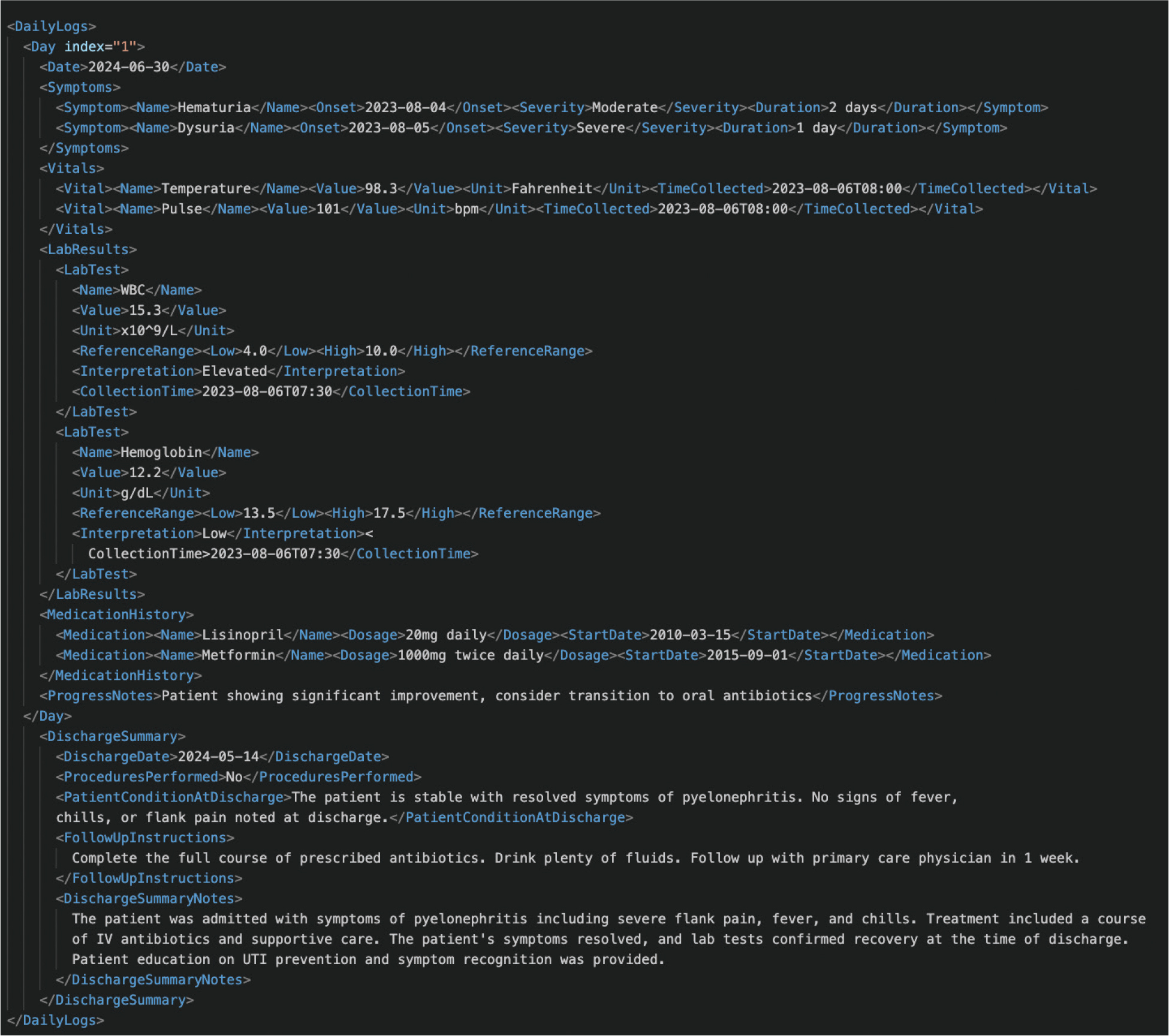 These elements were selected based on input from medical professionals experienced in UTI diagnosis and treatment. Appendix A and Appendix B illustrate examples of how medical history and daily logs might be structured in an XML format for processing by the system.
