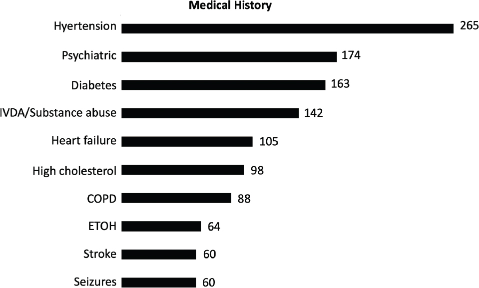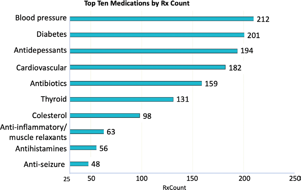 The most frequently prescribed medications were to treat hypertension, followed by psychiatric and respiratory medications. Over-the-counter medications such as acetaminophen/paracetamol, ibuprofen, and allergy medications were given to the patients, if required, at the time of the visit. The most frequently prescribed drugs are listed in Figure 2.