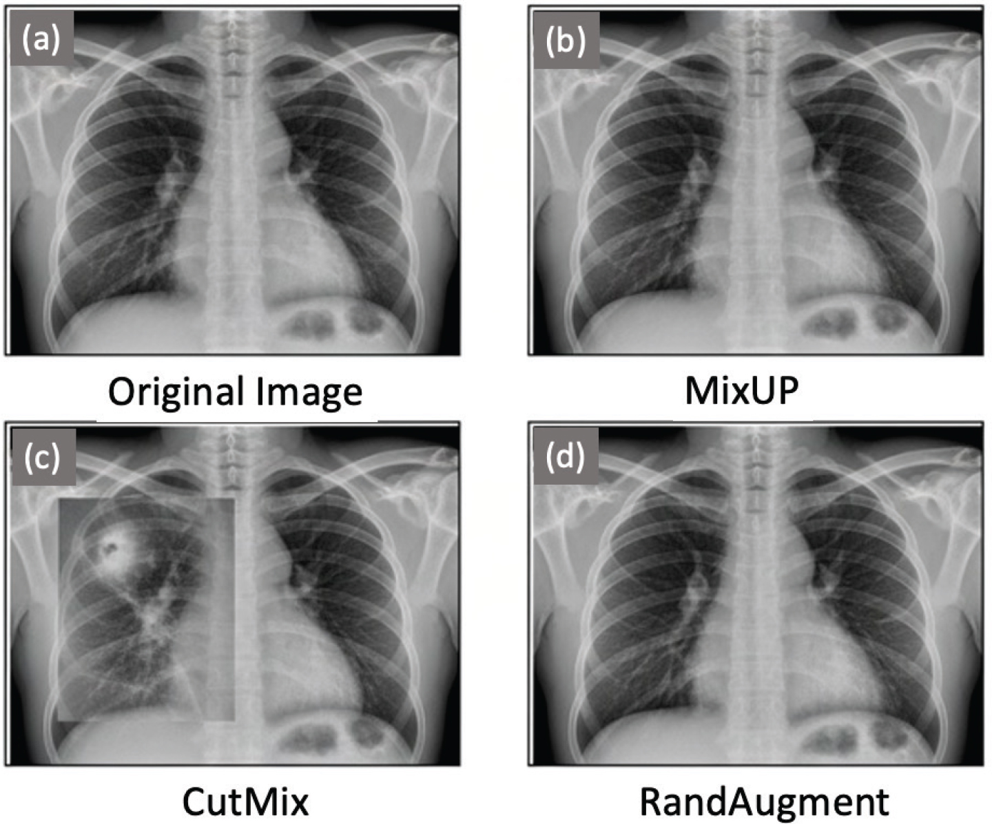 To minimize overfitting and support the applicability of the suggested framework, a set of data-augmentation methods were used (Figure 1). MixUp augmentation was used to create synthetic samples by mixing pixel values of two separate radiographs, and, as a result, the intermediate examples of every pair were created, which softened the decision boundary. CutMix increased the substitution of a randomly selected area of an image with an equivalent area on another radiograph, which forced the model to be trained to acquire discriminative features through an incomplete and composite structure. Finally, the randomly selected transformations were introduced in RandAugment (e.g. rotations, translations, brightness changes, and changes in contrast), and thus, controlled variability was added to recreate disparities in imaging acquisition protocols across hospitals.