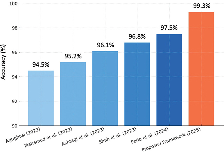 Figure 5 shows that earlier works achieved accuracies ranging from 94.5% to 97.5%, largely constrained to limited disease categories. In contrast, the proposed framework achieved 99.3% accuracy, demonstrating superior performance and broader applicability across six pulmonary conditions.