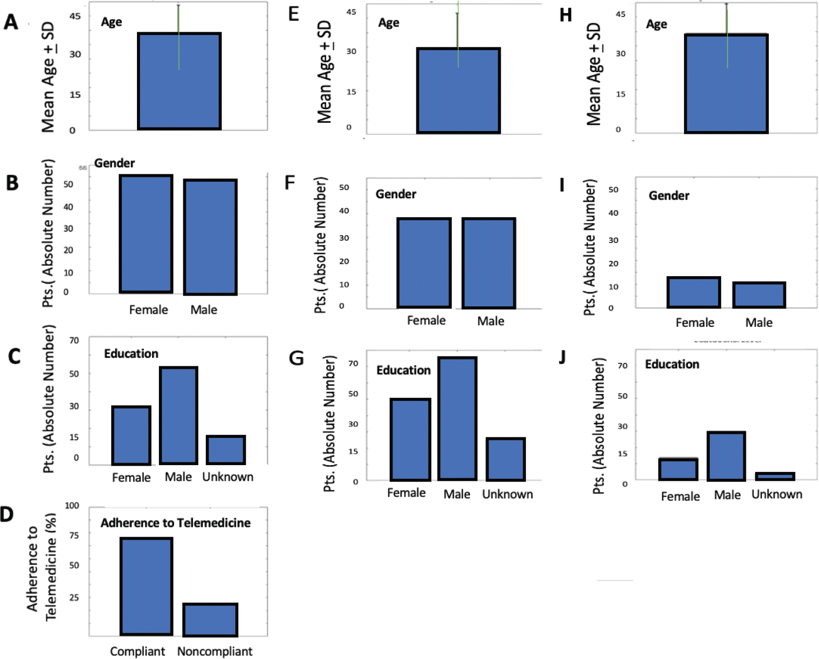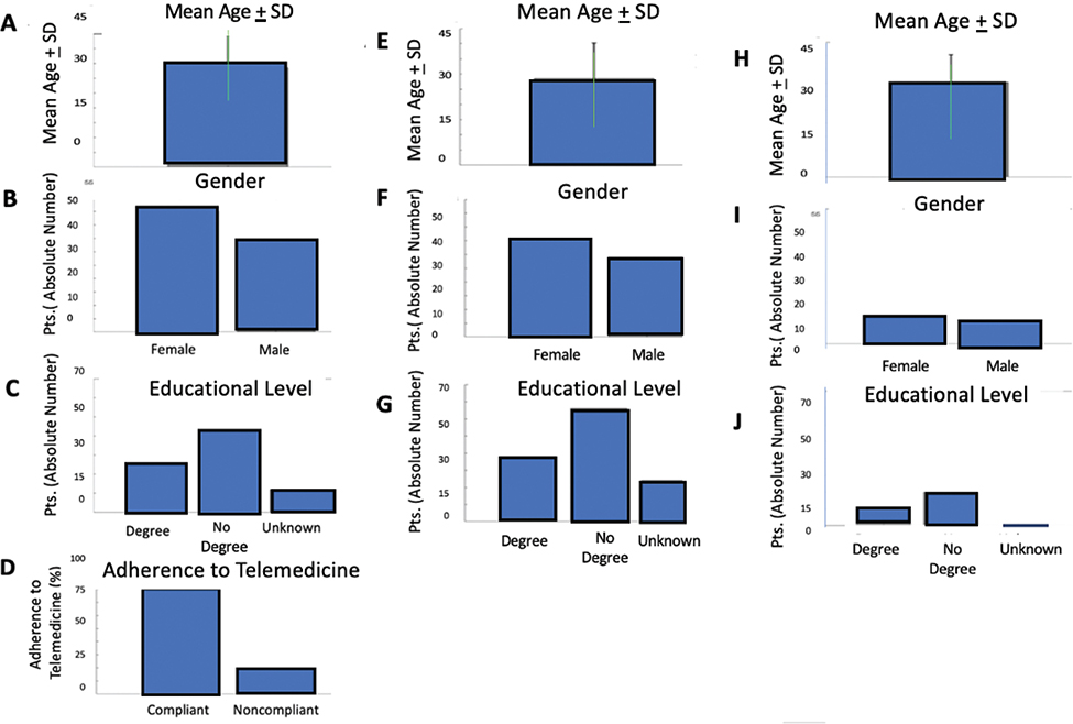 Fig. 1. Demographic characteristics, education level, and telemedicine adherence in the total study population. Mean age and standard deviation of the entire patient cohort (A) Numerical distribution of the entire cohort based on sex (B); Distribution of the entire cohort based on education level: graduates, non-graduates, and patients with undocumented education levels (C); Percentage of patients who adhered to telemedicine, calculated regarding the total patient cohort based on questionnaire responses (D); Mean age and standard deviation of all patients who adhered to telemedicine (E); Numerical distribution of all patients adhering to telemedicine based on sex (F); Distribution of patients adhering to telemedicine based on education level: graduates, non-graduates, and patients with undocumented education levels (G); Mean age and standard deviation of all patients who did not adhere to telemedicine (H); Numerical distribution of non-adherent patients based on sex (I); Distribution of non-adherent patients based on education level: graduates, non-graduates, and patients with undocumented education levels (L).