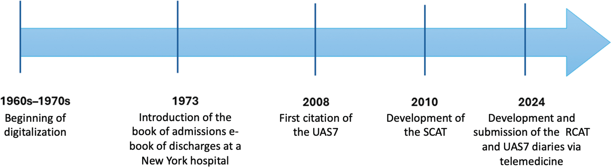 Fig. 4. Timeline of key milestones in digital data capture for allergology (1960s–2024). Milestones span early hospital digitalization (1960s–1970s)1,32 formal recordkeeping (1973),2,33 standardization of allergy PROs (UAS7, 20085,34 RCAT, 20106,35y and our 2024 telemedicine deployment for remote UAS7/RCAT diaries – providing the rationale for a next step via a mobile app with push notifications to sustain adherence over time. RCAT: Rhinitis Control Assessment Test; UAS7: Urticaria Activity Score 7.