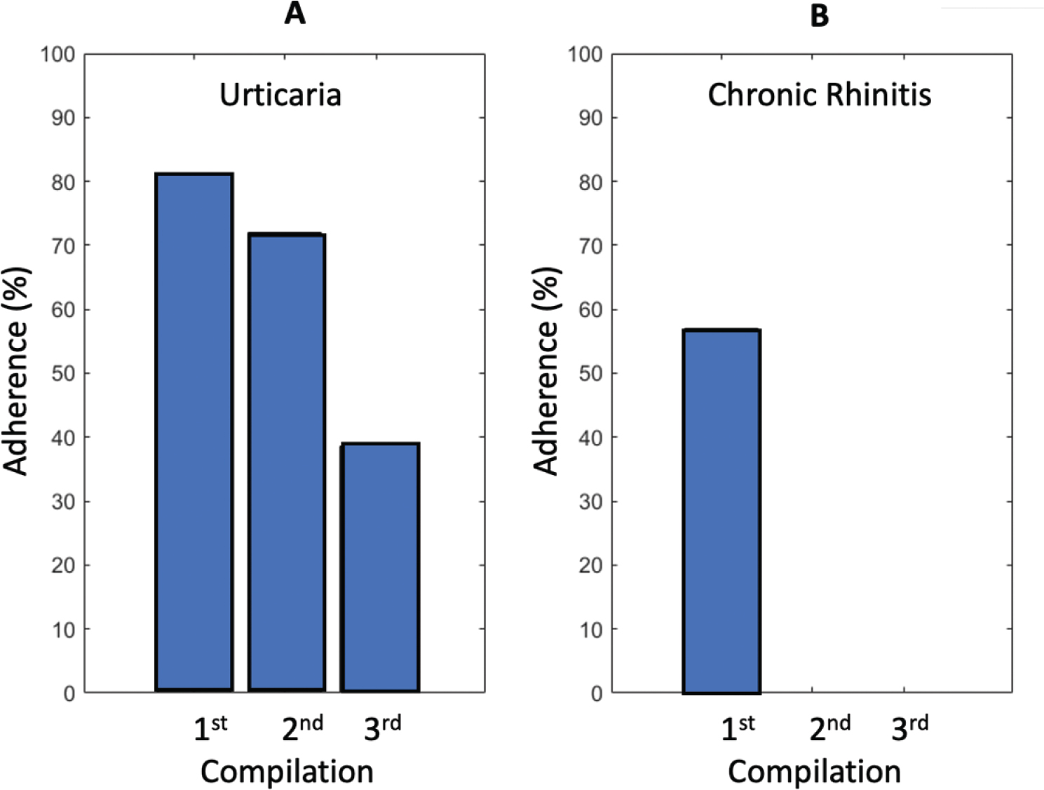 Supplemental Fig. 1. Percentage of telemedicine adherence in patients with chronic urticaria (A) and chronic rhinitis (B).