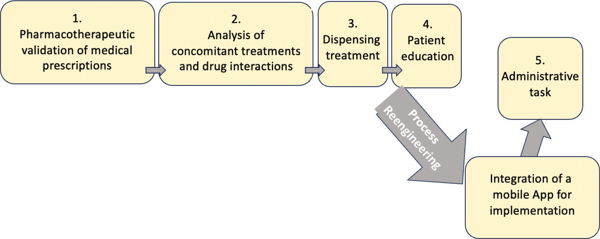Reengineering the pharmaceutical care process for outpatient treatment with the Office of Aging and Adult Services (OAAS) at the SAAS Incorporating Digital Tools focused on the pharmaceutical care process being redesigned using a co-creation approach involving all SAAS pharmacists through a structured working session and strengths, weaknesses, opportunities, and threats (SWOT) analysis.18