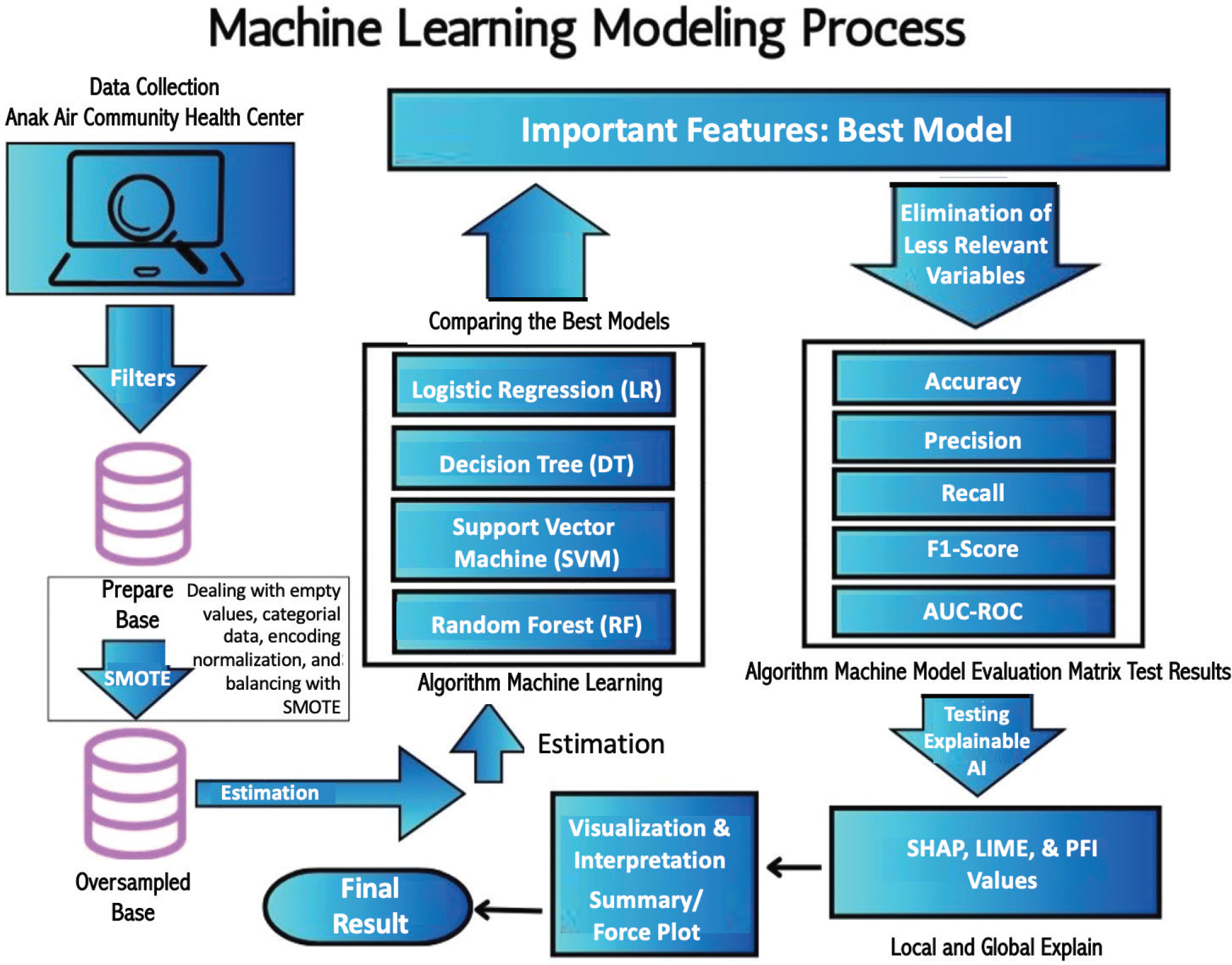 This study uses an ML modeling approach with a multi-method XAI method to predict preeclampsia risk in pregnant women. The modeling process is carried out in several systematic stages, as shown in Figure 2.