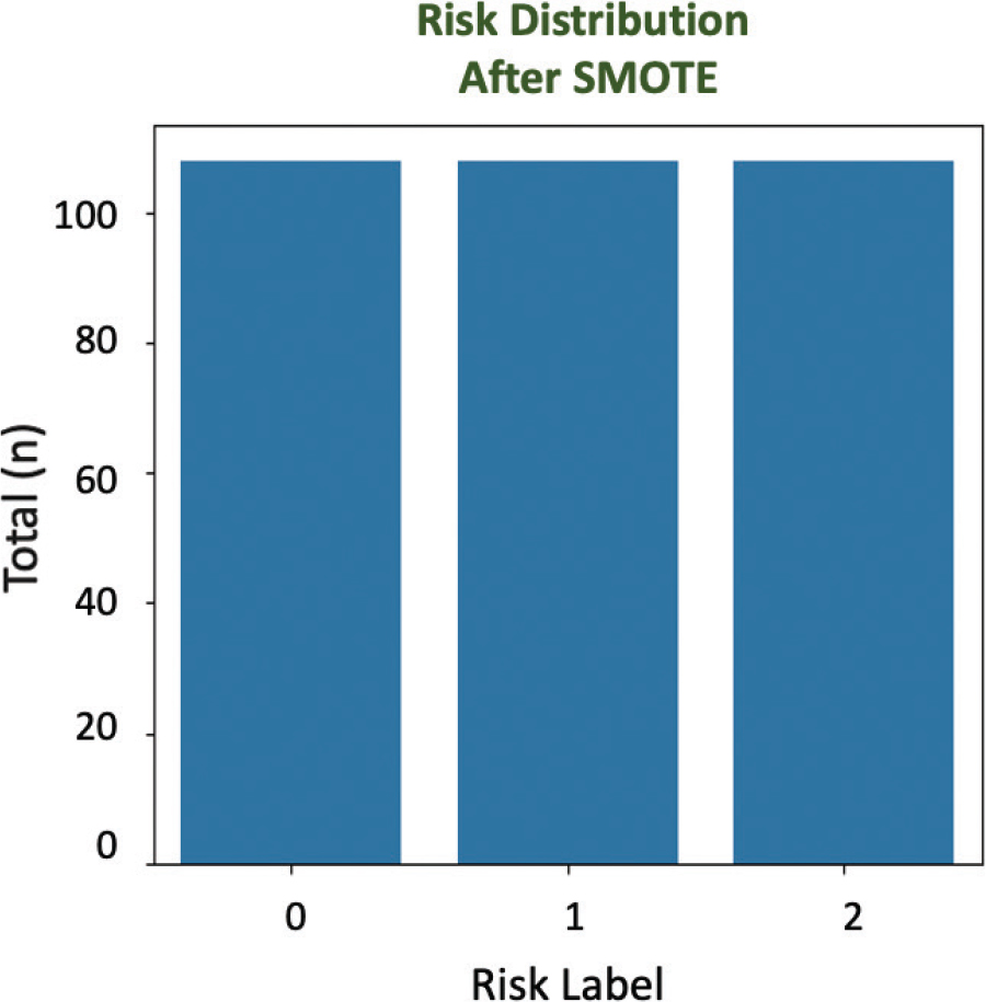 SMOTE application successfully balanced the amount of data in each risk label, which was previously uneven, eliminating bias toward the dominant class. Accordingly, each category (Label 0, Label 1, and Label 2) has 108 samples. This helps the model to recognize patterns evenly and improves the accuracy of risk predictions (Figure 4).
