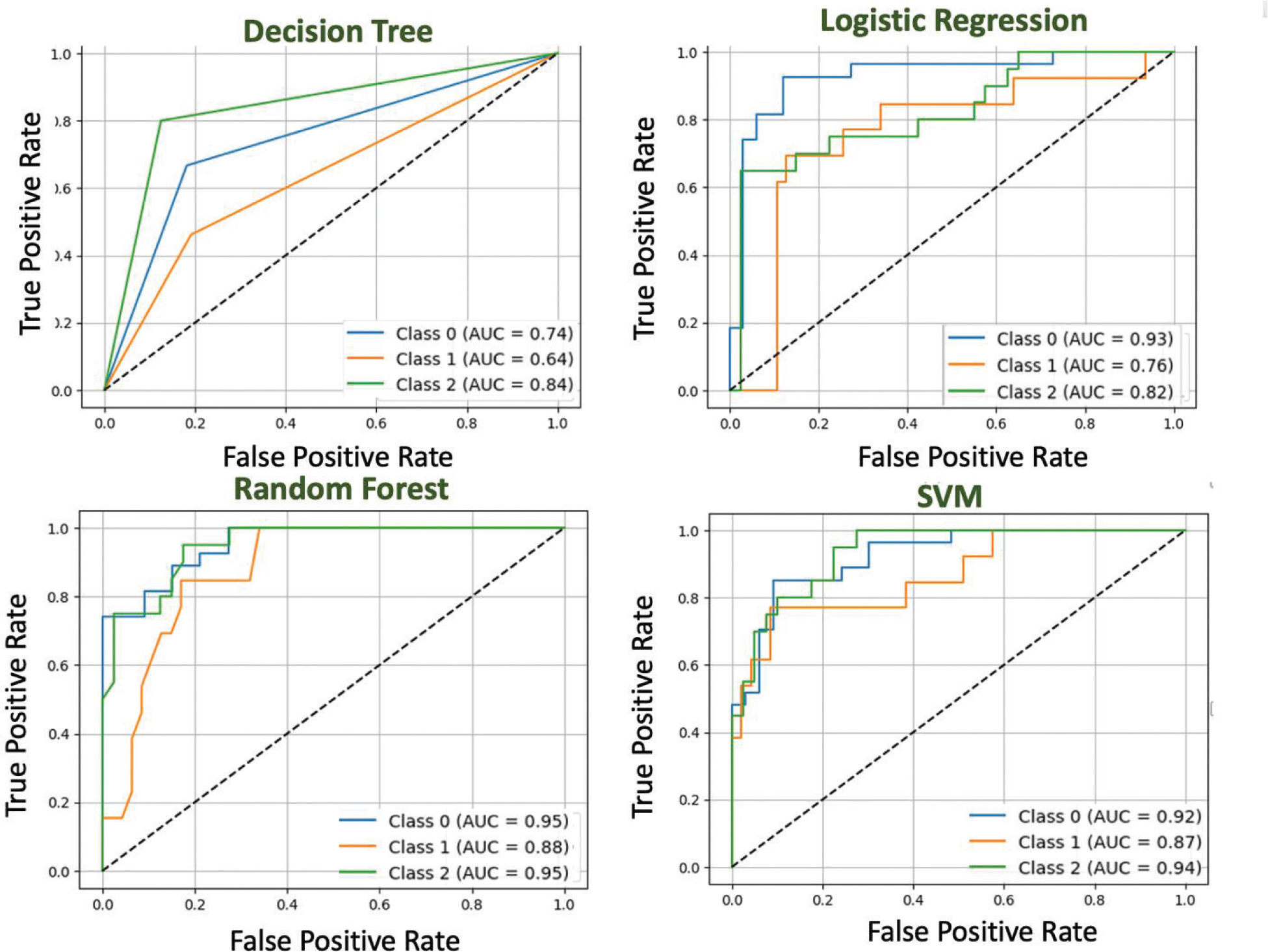 As shown in Figure 6, RF and SVM had the most consistent discriminative performance across all risk categories. Meanwhile, decision tree and logistic regression showed greater variability. Overall, ensemble-based models demonstrated superior class separability under the applied internal validation framework.