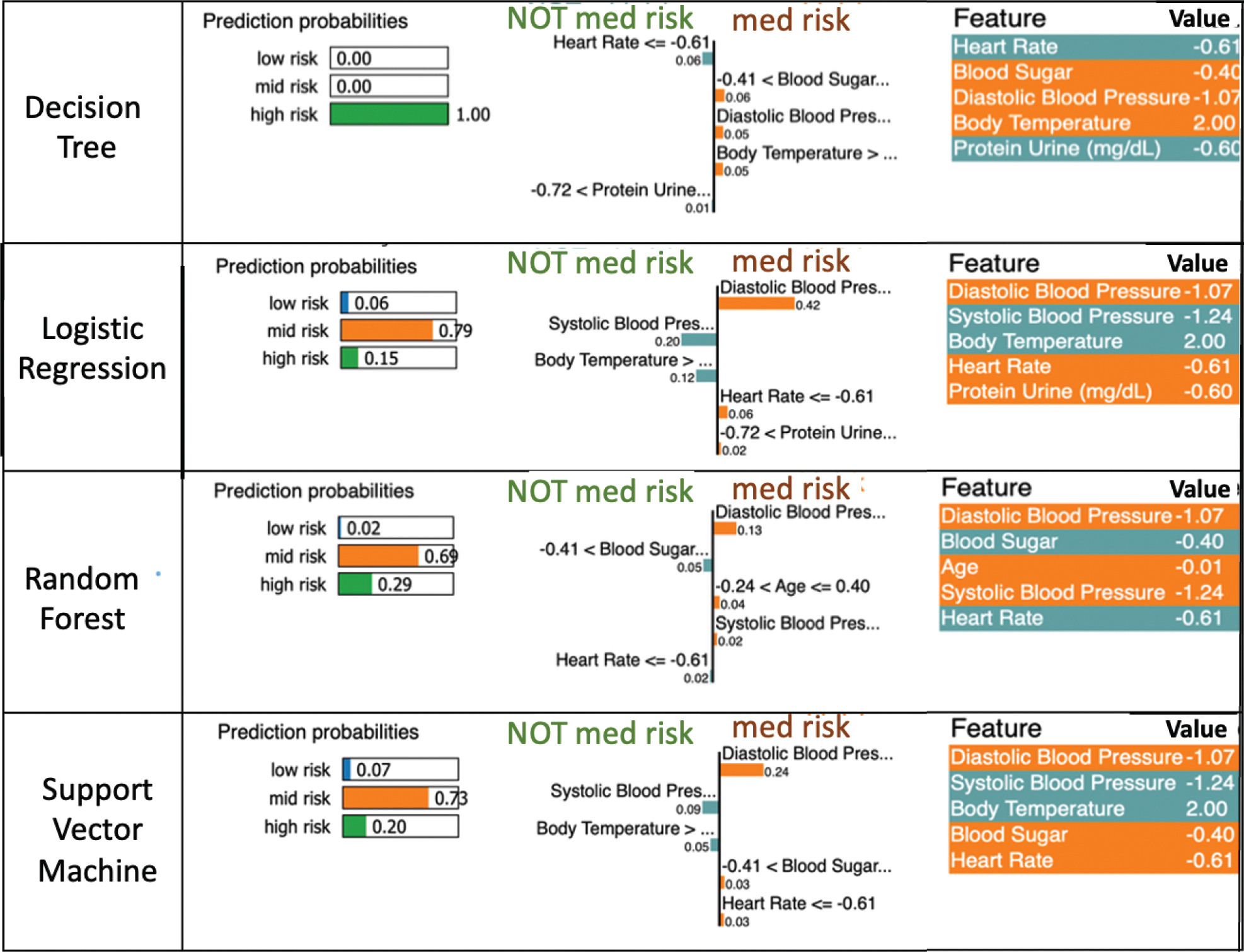 In Figure 8, LIME analysis reveals the differences in focus of each algorithm. It highlighted model-specific local decision patterns, reinforcing the complementary role of local explanations alongside global interpretability methods. Although blood pressure variables were consistently among the most influential features across models, their relative importance varied depending on the algorithm and explainability method.