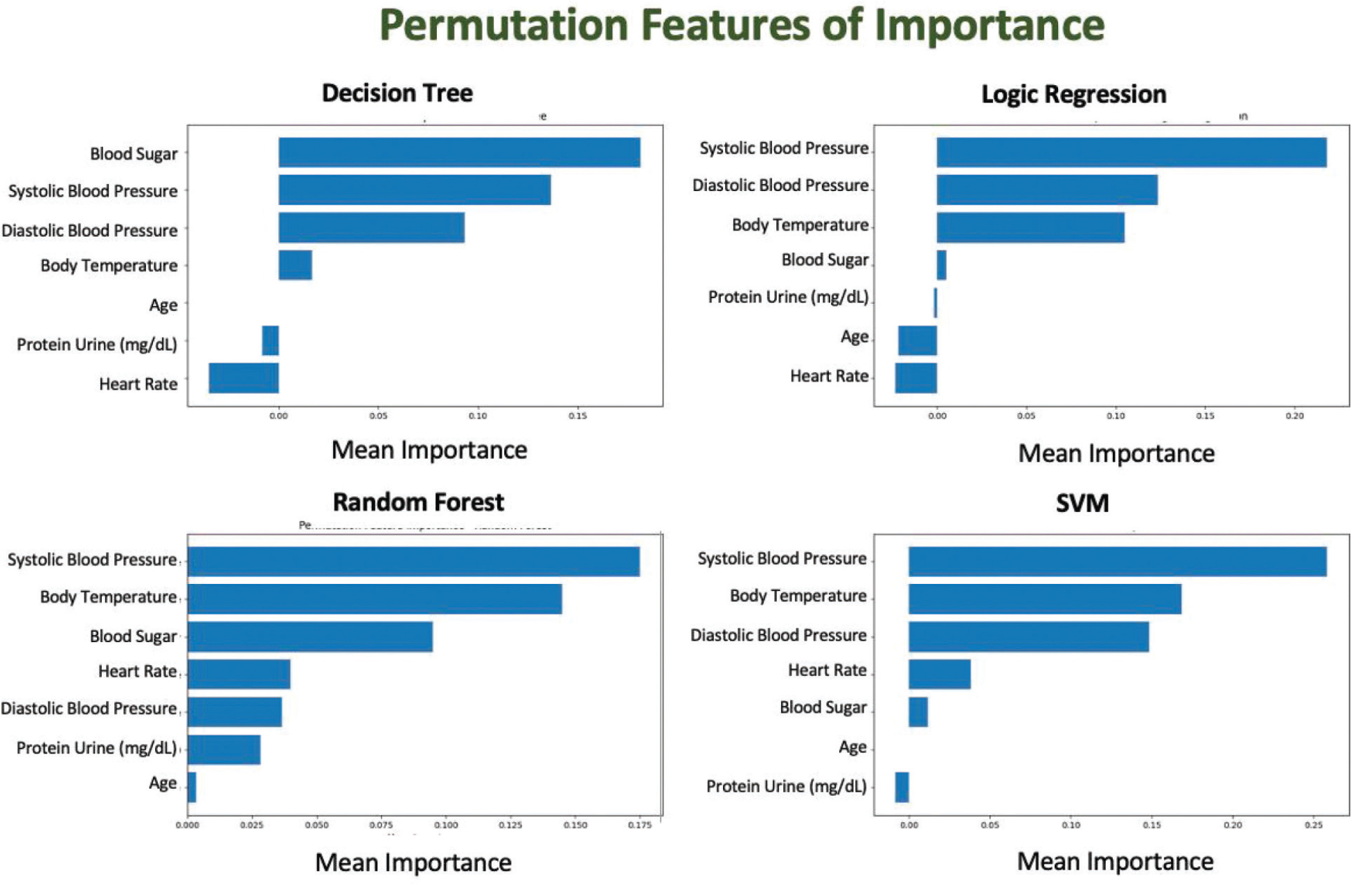 PFI (Figure 9) shows feature sensitivity differed across models. While blood pressure variables frequently contributed to performance changes, other features, such as blood glucose and body temperature, played model-dependent roles.